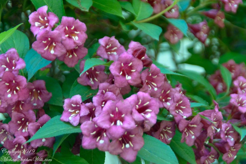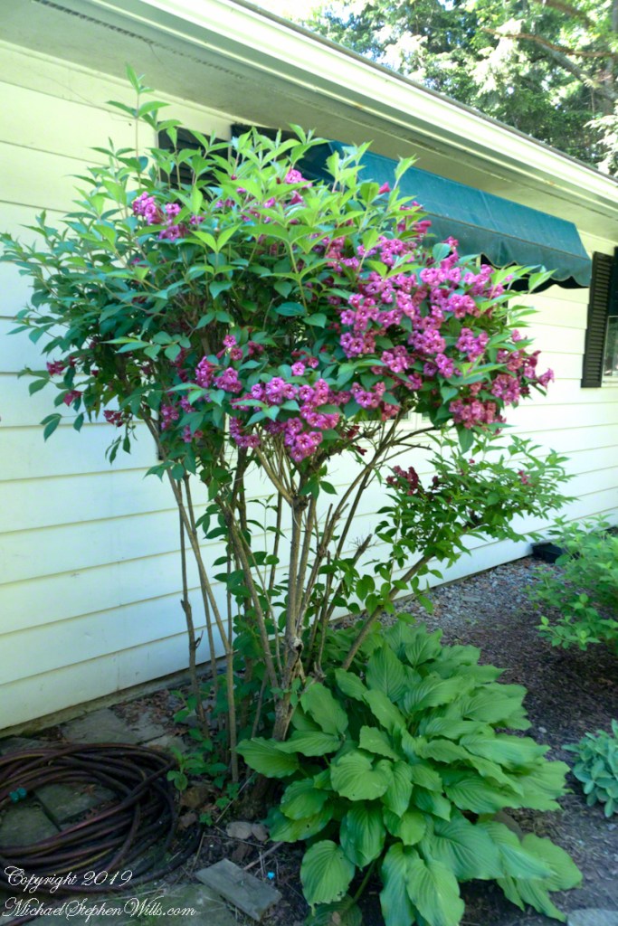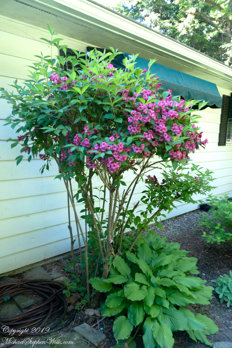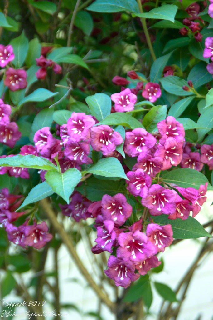 Thank you to the readers whose thoughtful responses appeared these past two days. Pam and I were caring for two grandchildren and, last evening after their Mom picked them up, I sat down with “The Botanical Garden” by Phillips and Rix, Volume I (2002, Firefly Books, Buffalo, New York and Willowdale, Ontario) and a sprig of the leaves and flowers and narrowed the choices to the genus Weigela of the family Caprifoliaceae.