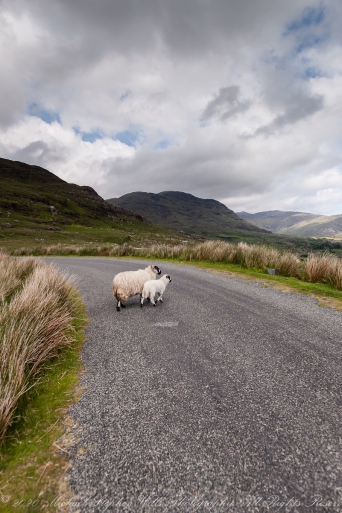 A Ewe and Lambkin cross The Famine Road with the Adrigole River valley in background. The original road was built as a public works project during the Great Famine, improved in the 1930’s and named after the first Governor-General of the Irish Free State, Timothy Michael Healy.