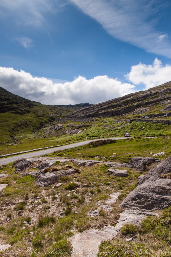 Healy Pass, R574, negotiating the ridge above the Adrigole River valley. The photographer’s vehicle and Pam are visible in a turnoff. Her red raincoat stands out among the green.