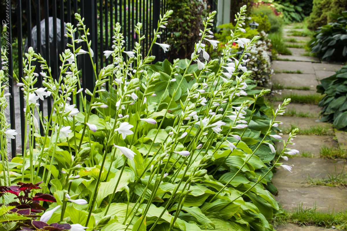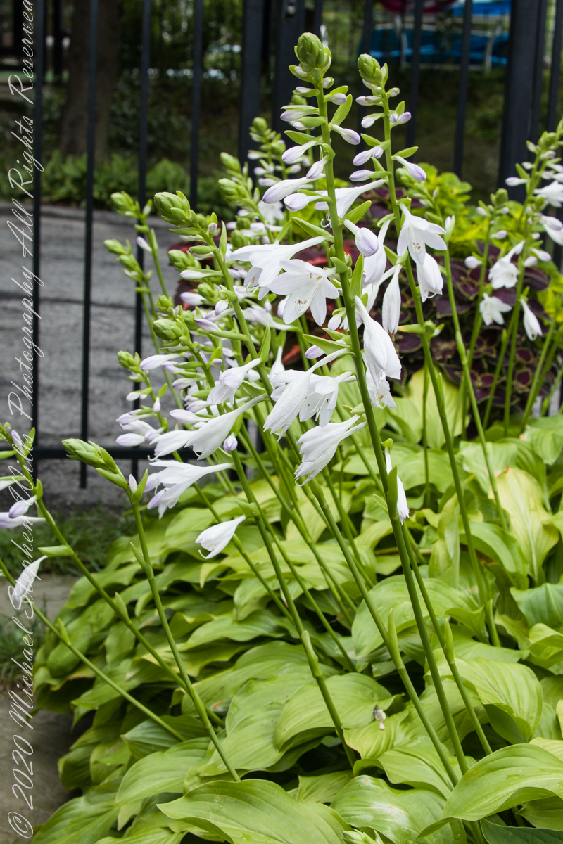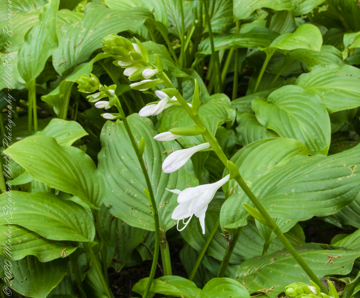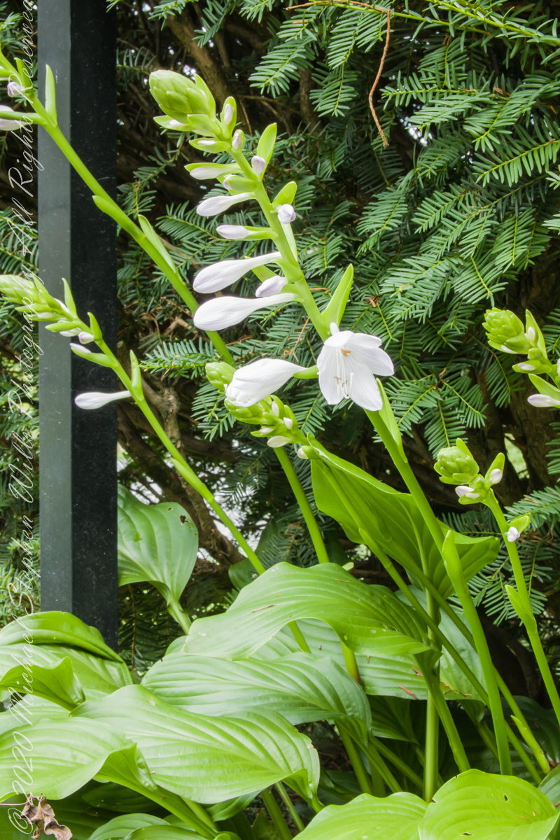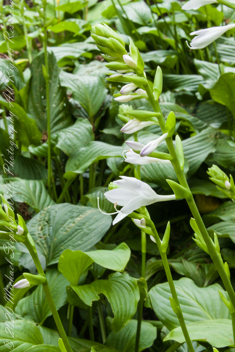 Pam requested photographs of hosta flower stalks with blooms and developing buds. I setup the Manfrotto tripod, the Canon dslr mounted with an Canon EF 70-300mm f/4.5-5.6L lens at ISO 1600 and these are the results.