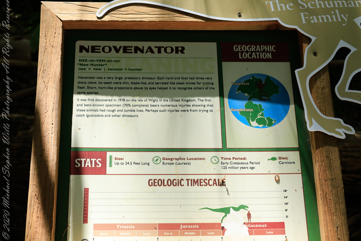 Neovenator was a very large, predatory dinosaur. Each hand and foot had three very sharp claws. Its teeth were thin, blade-like, and serrated like steak knives for cutting flesh. Short, horn-like projections above its eyes helped to recognize others of the same species. First discovered in 1978 on the Isla of Wight, United Kingdom. The fist and best-known specimen (70% complete) bears numerous injuries showing that these animals had rough and tumble lives. Perhaps such injuries were from trying to catch Iguanodons and other dinosaurs. Neovenator is derived from the latin words for “now” and “hunter.”