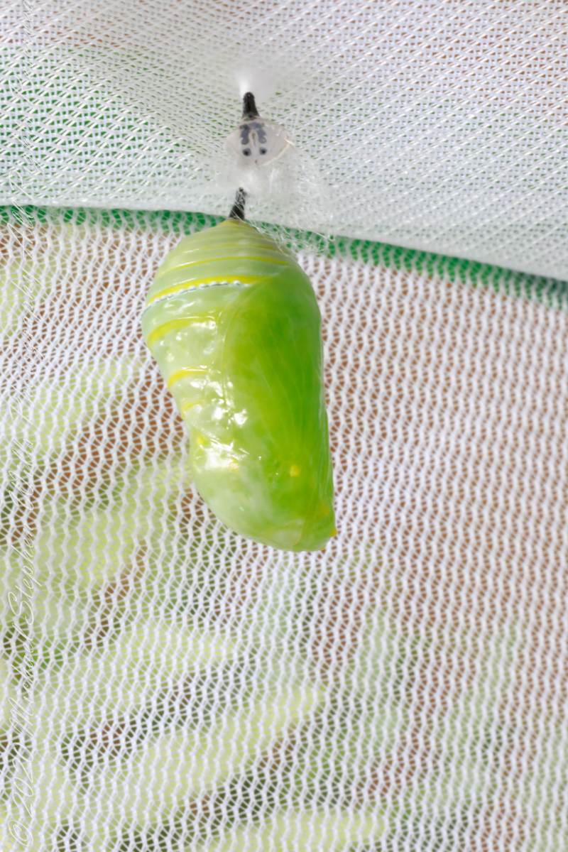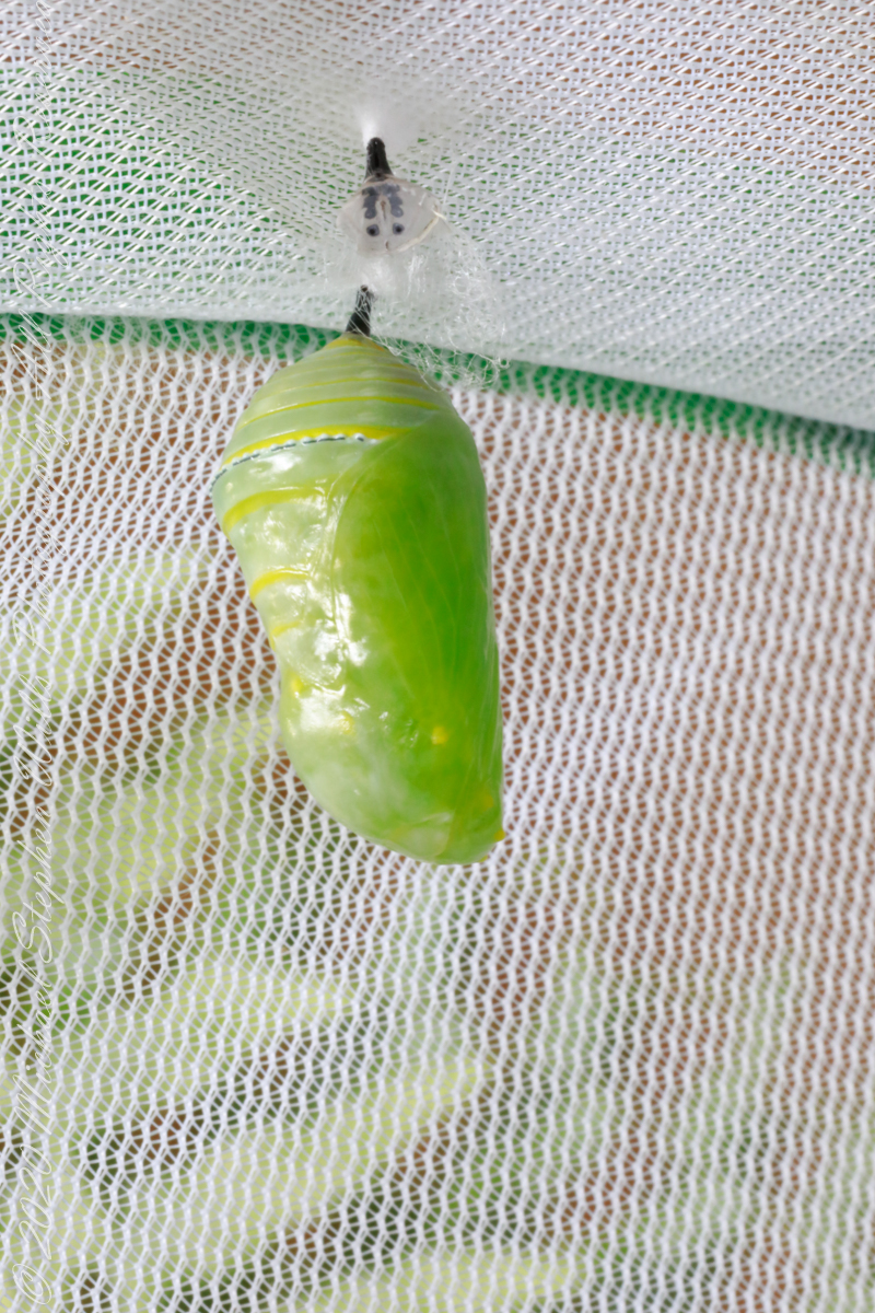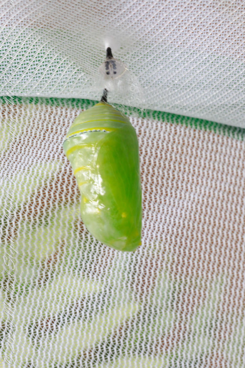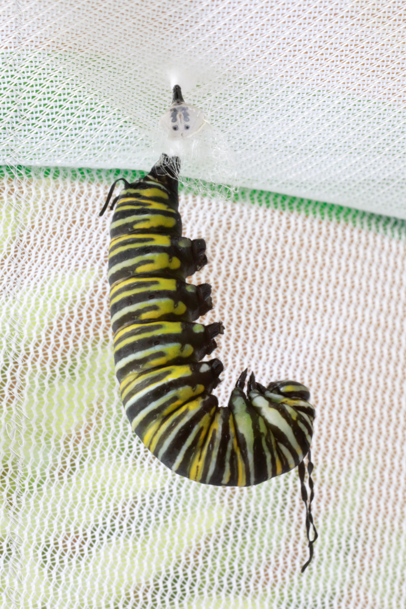 Here is a photographic Series of a Monarch caterpillar chrysalis transformation, a step in the life cycle of the Monarch butterfly. The caterpillar attaches to a silk pad from which it hangs. Underneath the skin, the caterpillar is transforming to the chrysalis. In these photographs the silk pad and chrysalis attachment from a previous transformation are in the foreground.