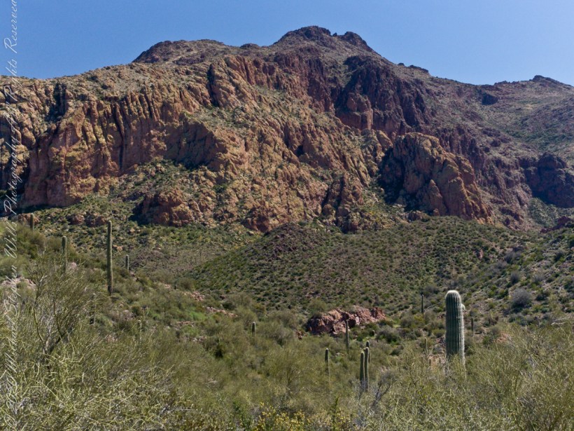 Closer to the junction with Terrapin Trail this Bluff Spring Mountain ridge rose above us. A fine specimen of mature Saguaro cactus is in midground.