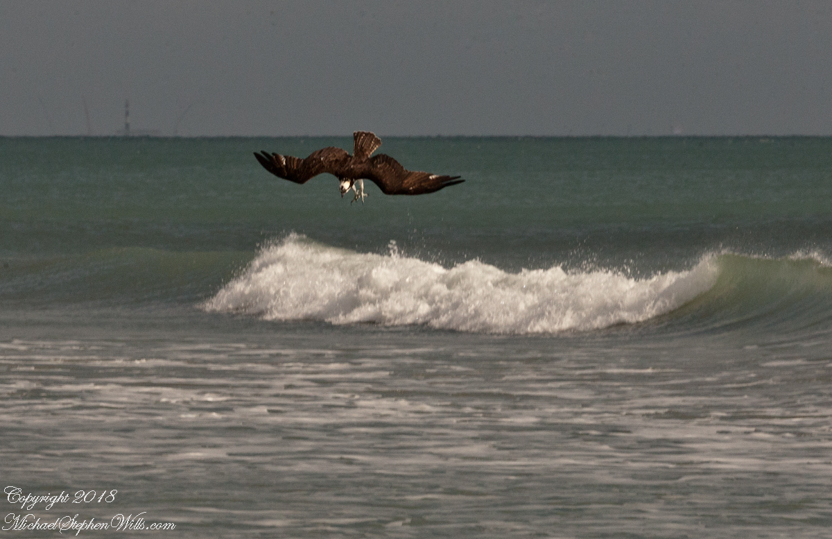 The lighthouse is in the background (to the left of diving osprey) of this photograph from a previous posting, “Dive!!.” The structure exists to warn ships of dangerous, shallow shoals that begin 13.5 miles from the cape. The visible pattern of the tower, called daymark, identifies it as the Cape Canaveral Lighthouse. From here it is a little more than 10 miles distant, so its daymark is visible to alert observers from beyond the most distant shoals on a clear day.
