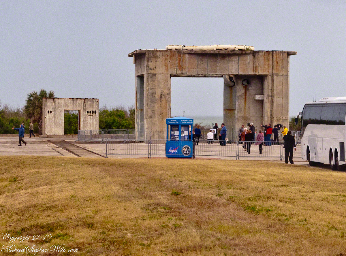 By chance our Lighthouse tour was January 27, 2019 the 51st anniversary of the loss of Grissom, White and Chaffee. As we approached the complex parked buses and a gathering of people came into view. All that is left is the massive poured concrete base of the launch tower, topped with rusting pipes.