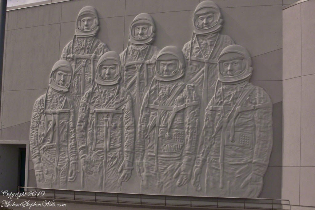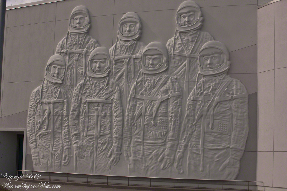 A monumental relief on the facade of Kennedy Space Center “Heroes and Legends” is from an iconic Project Mercury 7 photograph. Glenn is third from left, front row.