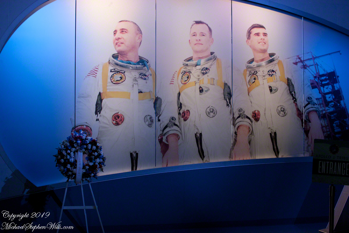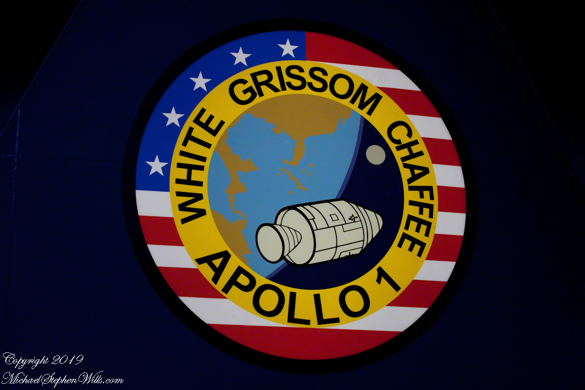 Gus Grissom, center top in the relief, was the veteran astronaut on the Apollo 1 crew, with Ed White and Roger B. Chaffee. White was the first American to walk in space during Program Gemini . Chaffee entered the space program with Program Apollo. These are images from the “Heroes and Legends” memorial to Apollo 1: the mission patch created by the crew, the three on-site in front of the launch pad. The patch is reproduced on the space capsule.