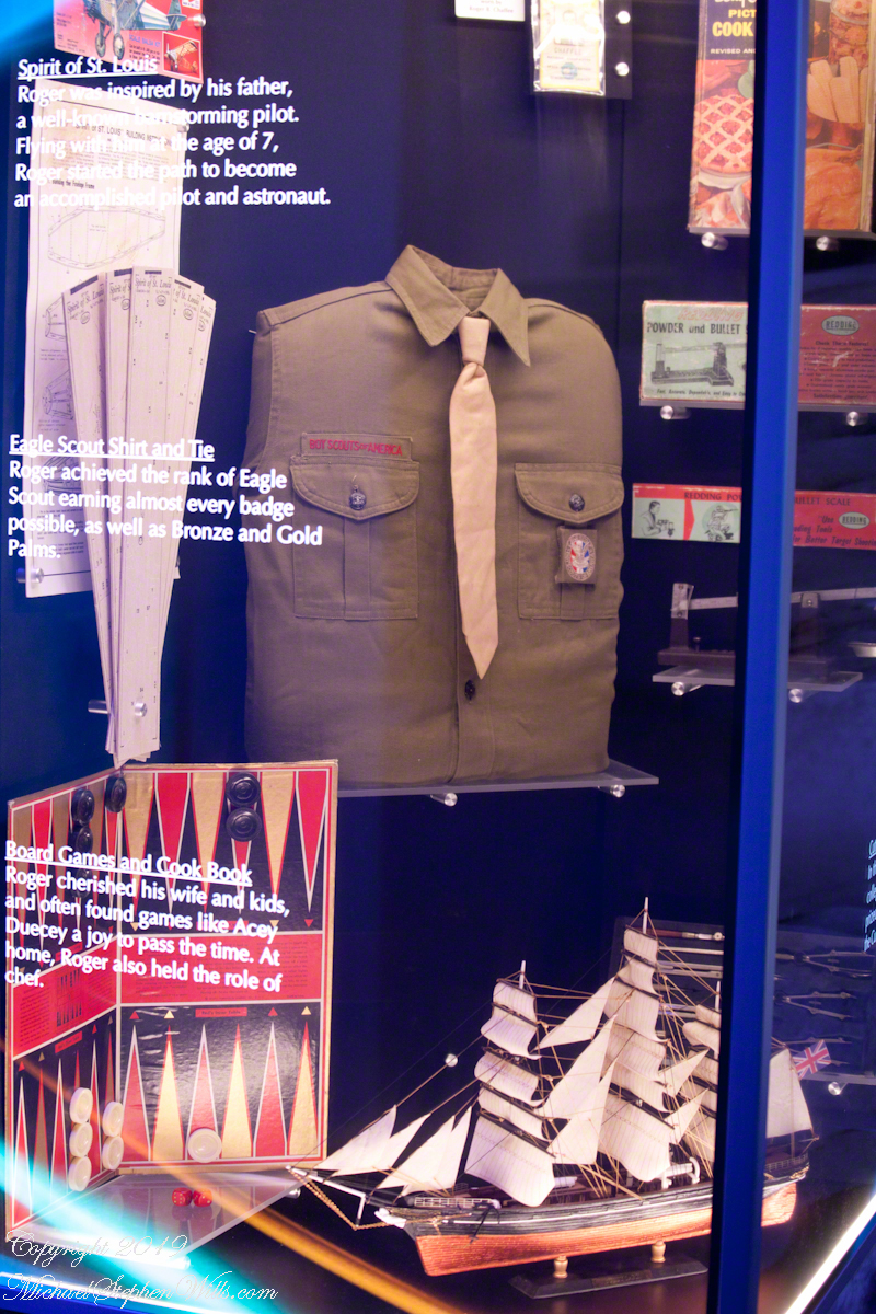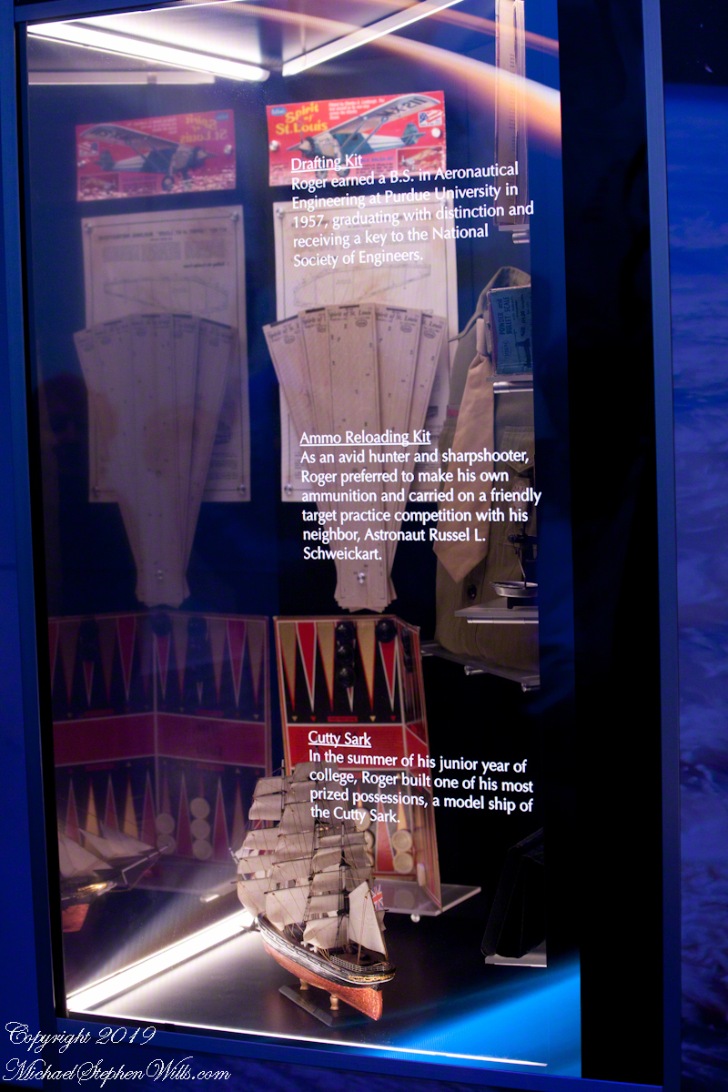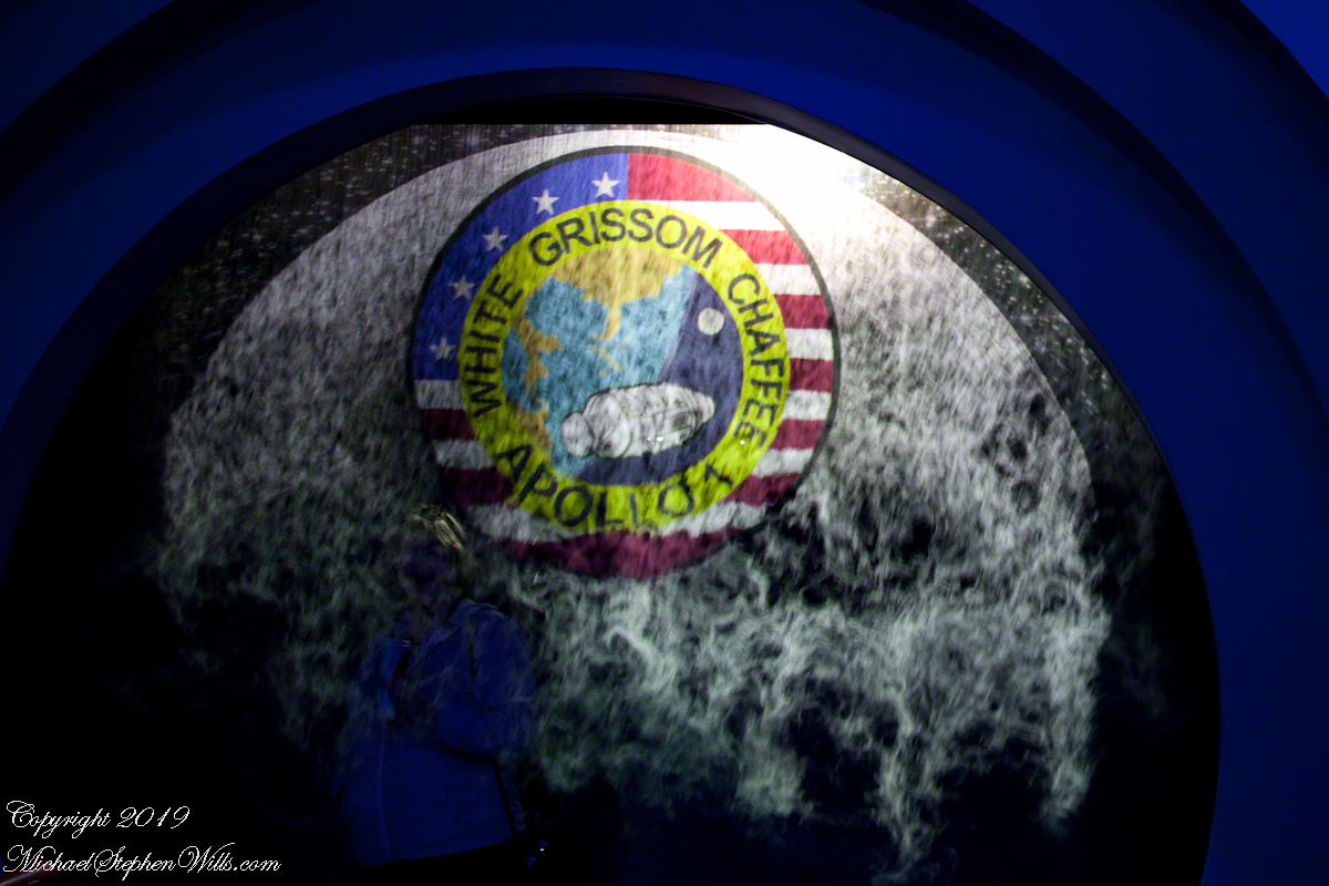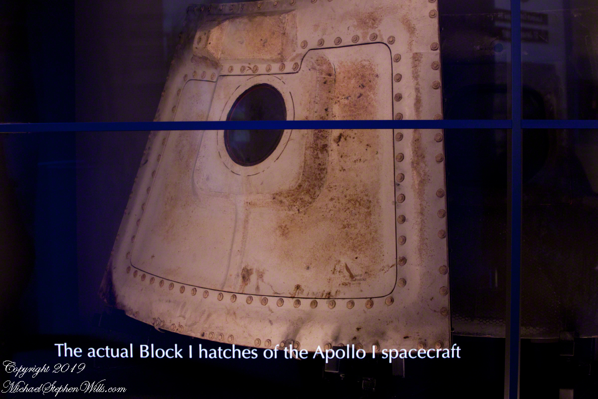 My photographs are from the “Heroes and Legends” exhibits of Apollo 1 and later missions. Above, next to the burned capsule hatch is the seared capsule mission patch. Below, a moving display is the personal effects of the lost astronauts.