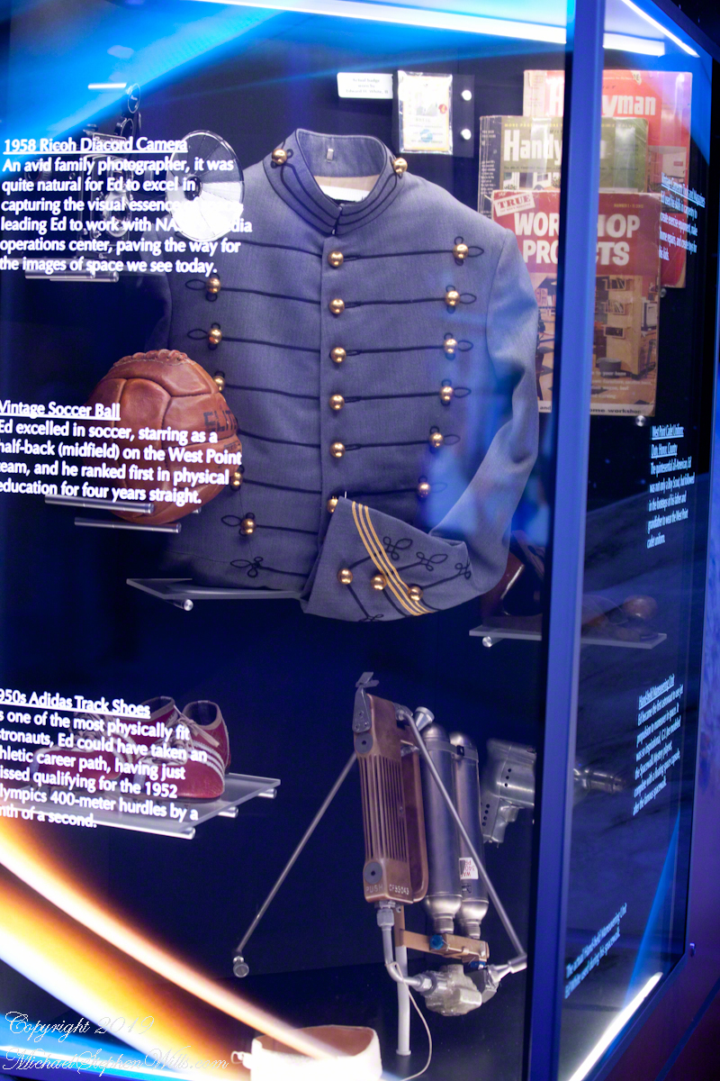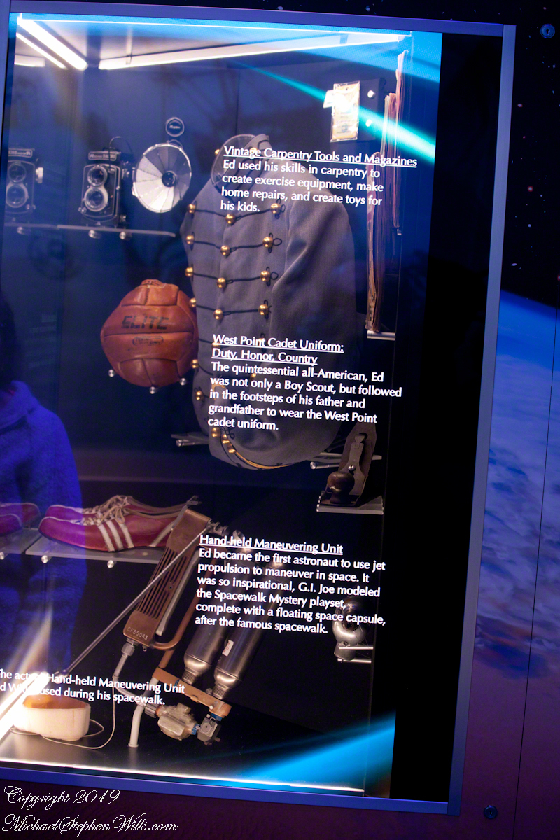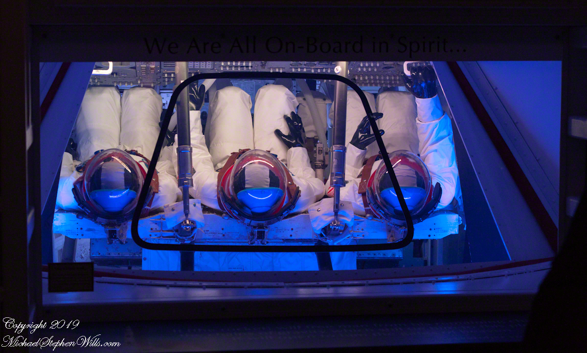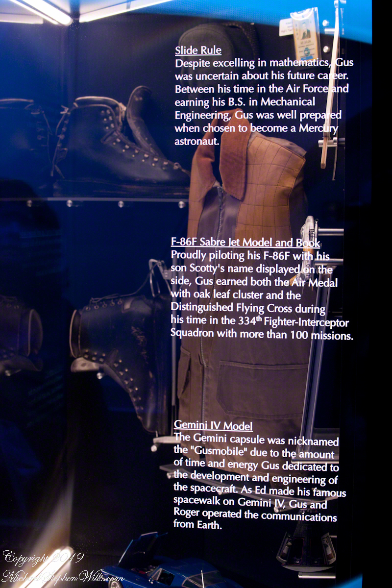 My photographs are from the “Heroes and Legends” exhibits of Apollo 1 and later missions. Above, next to the burned capsule hatch is the seared capsule mission patch. Below, a moving display is the personal effects of the lost astronauts.