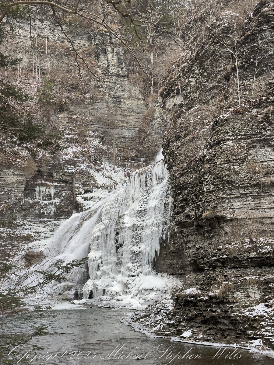 Standing there, it’s impossible not to feel the weight of deep history. These rocks remember glaciers and warmer seas; this creek has been at work since before memory had a word. January merely adds a chapter. Snow feathers the ledges. A stray sunbeam slips into the gorge, briefly igniting the ice, and then is gone. The falls return to their monochrome palette, as dignified as an old photograph.