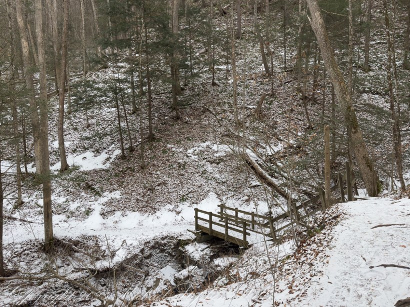 The trail begins quietly, a soft crunch underfoot where snow thins to leaf litter. Hemlocks hold their breath. The gorge opens in increments, not all at once, and the creek’s voice arrives in fragments—first a whisper, then a steady insistence. Winter edits the landscape with a clean hand. The clutter of summer understory is gone; what remains is structure: stratified shale stacked like a book left open to a single, patient chapter. Every footfall demands attention. Ice slicks the stone where seeps cross the path, and the trail teaches a winter gait—short steps, weight centered, the quiet confidence of traction earned rather than assumed.