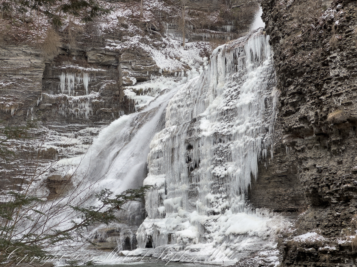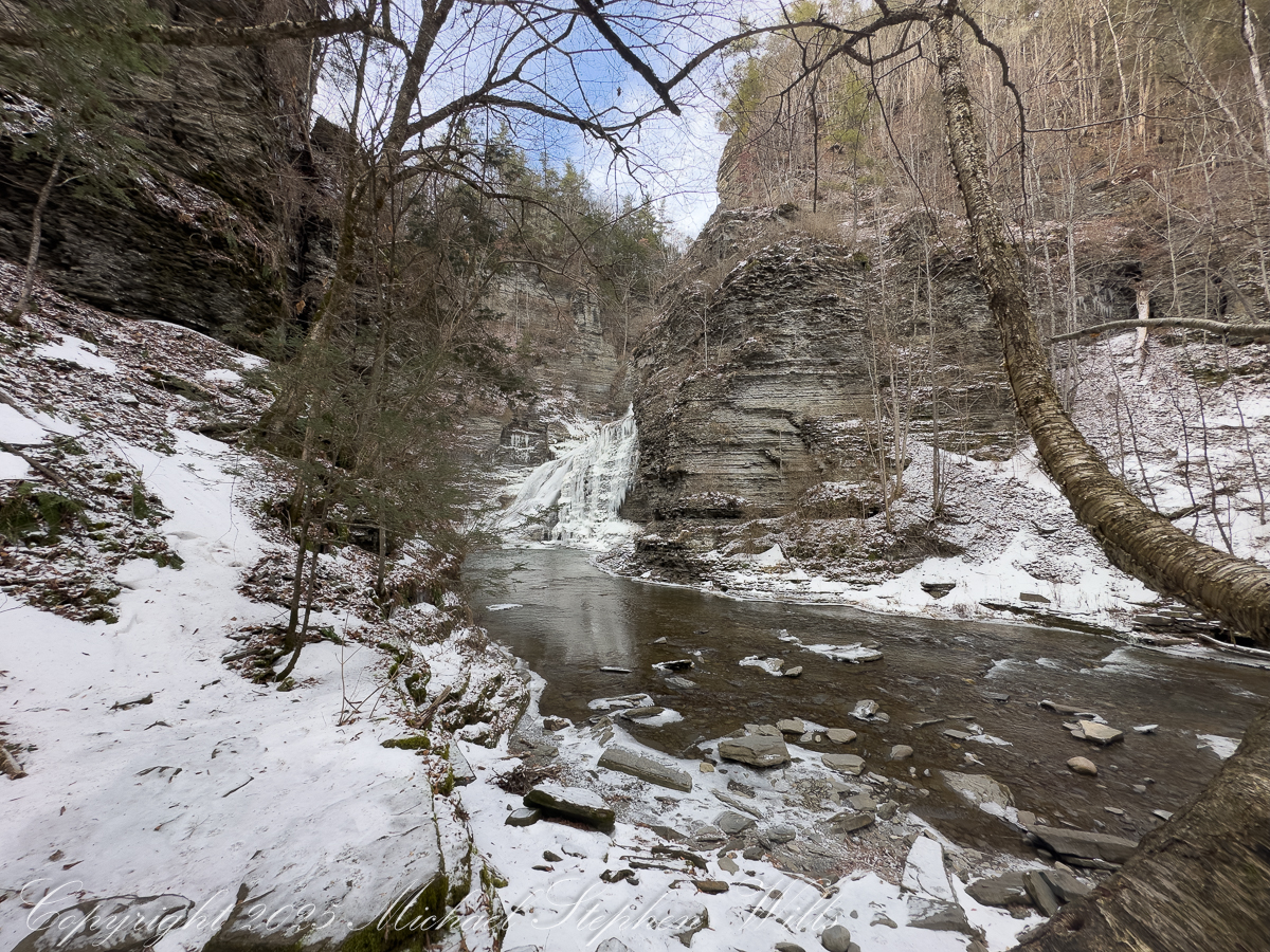 Standing there, it’s impossible not to feel the weight of deep history. These rocks remember glaciers and warmer seas; this creek has been at work since before memory had a word. January merely adds a chapter. Snow feathers the ledges. A stray sunbeam slips into the gorge, briefly igniting the ice, and then is gone. The falls return to their monochrome palette, as dignified as an old photograph.