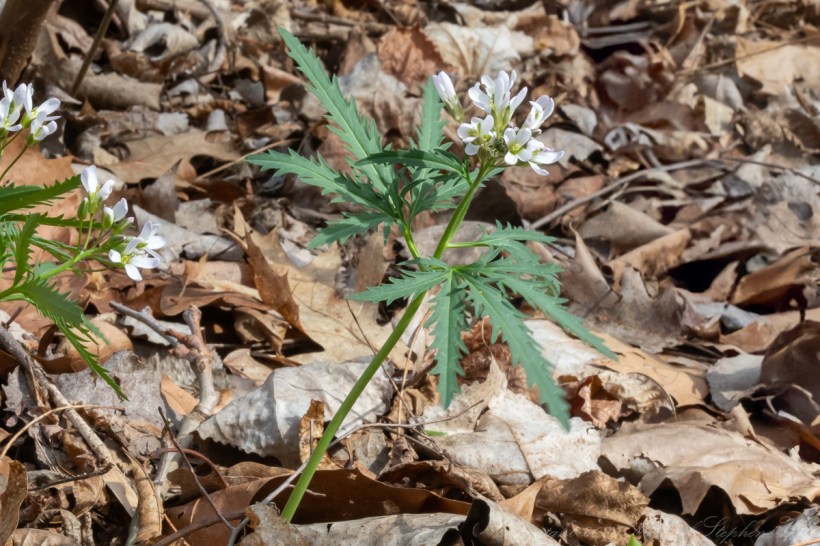 At first glance the plant seemed almost improbably delicate, as if it had been assembled from a set of fine green gestures and then topped with small white crosses of bloom. The flowers hovered just above the leaf litter, each with four petals, clear evidence of the mustard family to which the plant belongs. The leaves were deeply divided, sharply cut, almost hand-like in their spread, giving the plant its common name. There is something elegant in that foliage: not the broad, self-confident green of summer, but a more intricate, provisional architecture, suited to the brief bright interval before the forest canopy closes.