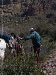 Al Conant at Terrapin and Dutchman trails. His Appaloosa is enjoying fresh grass. Superstition Wilderness, Tonto National Forest, Arizona
