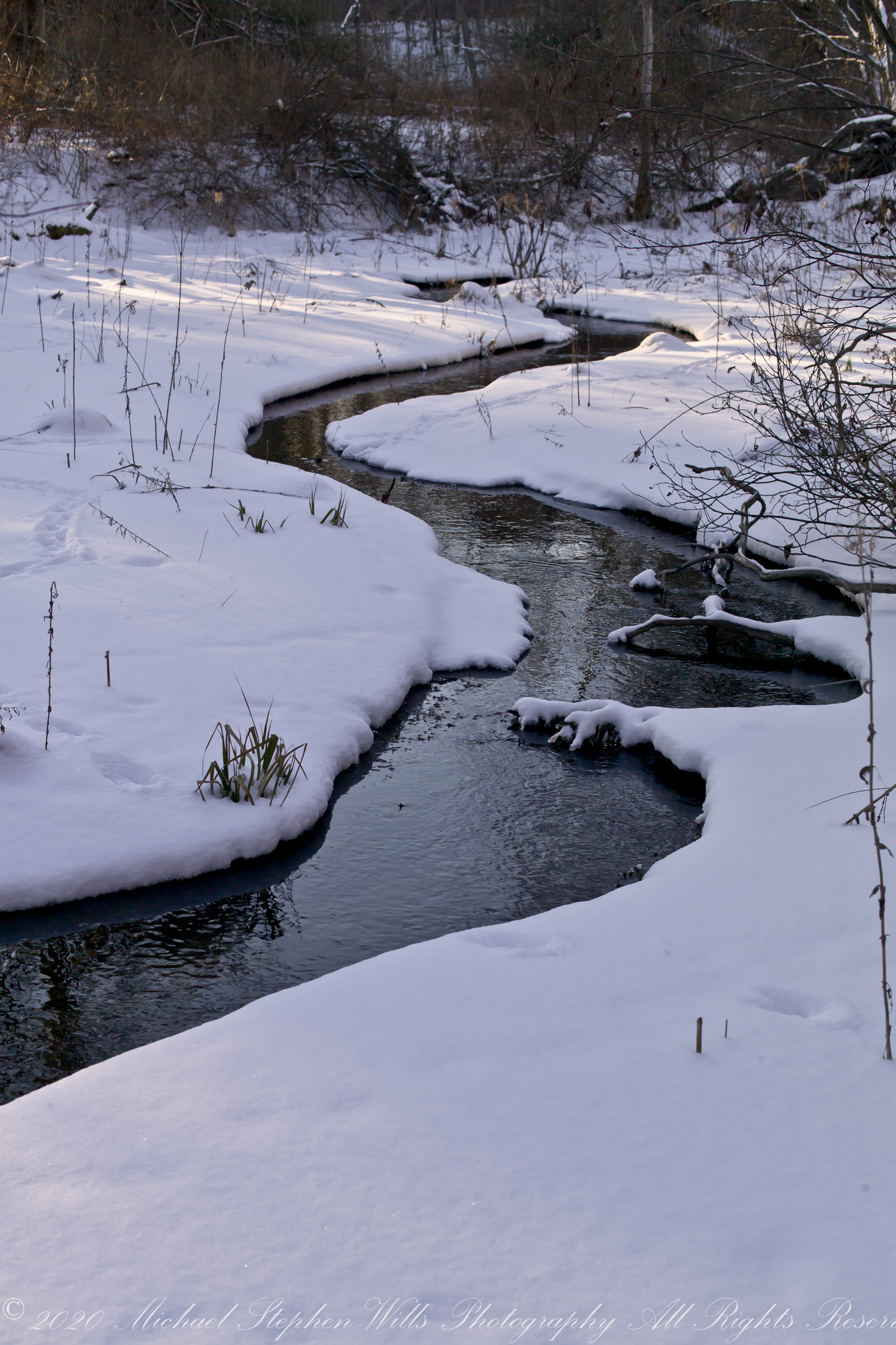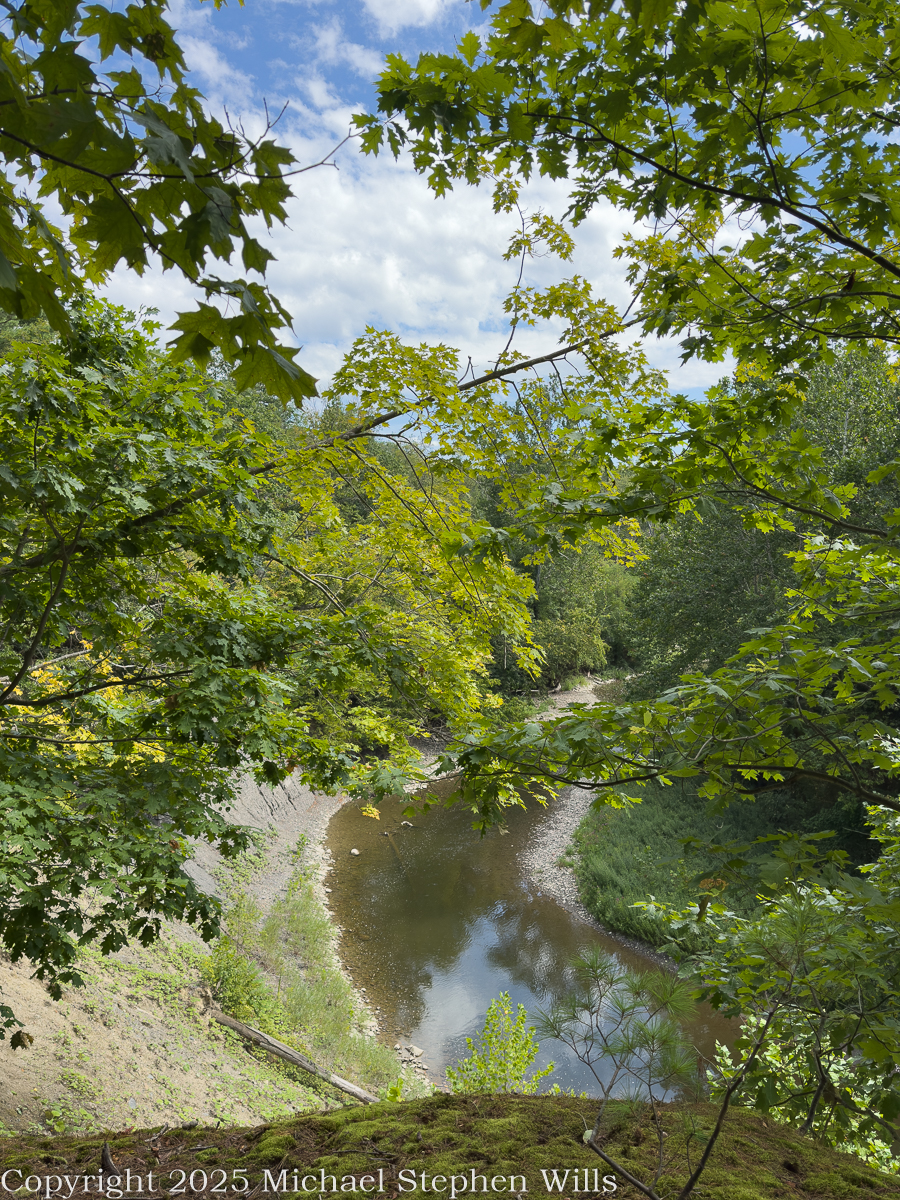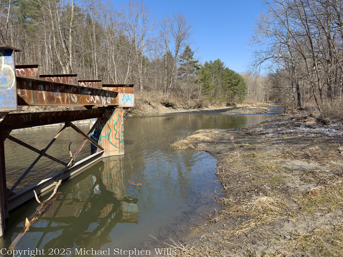 Fall Creek meanders through the esker fields of the Malloryville Preserve. Here is the view from an abandoned railroad bridge. The preserve is near Freeville in the Finger Lakes Region of New York State.