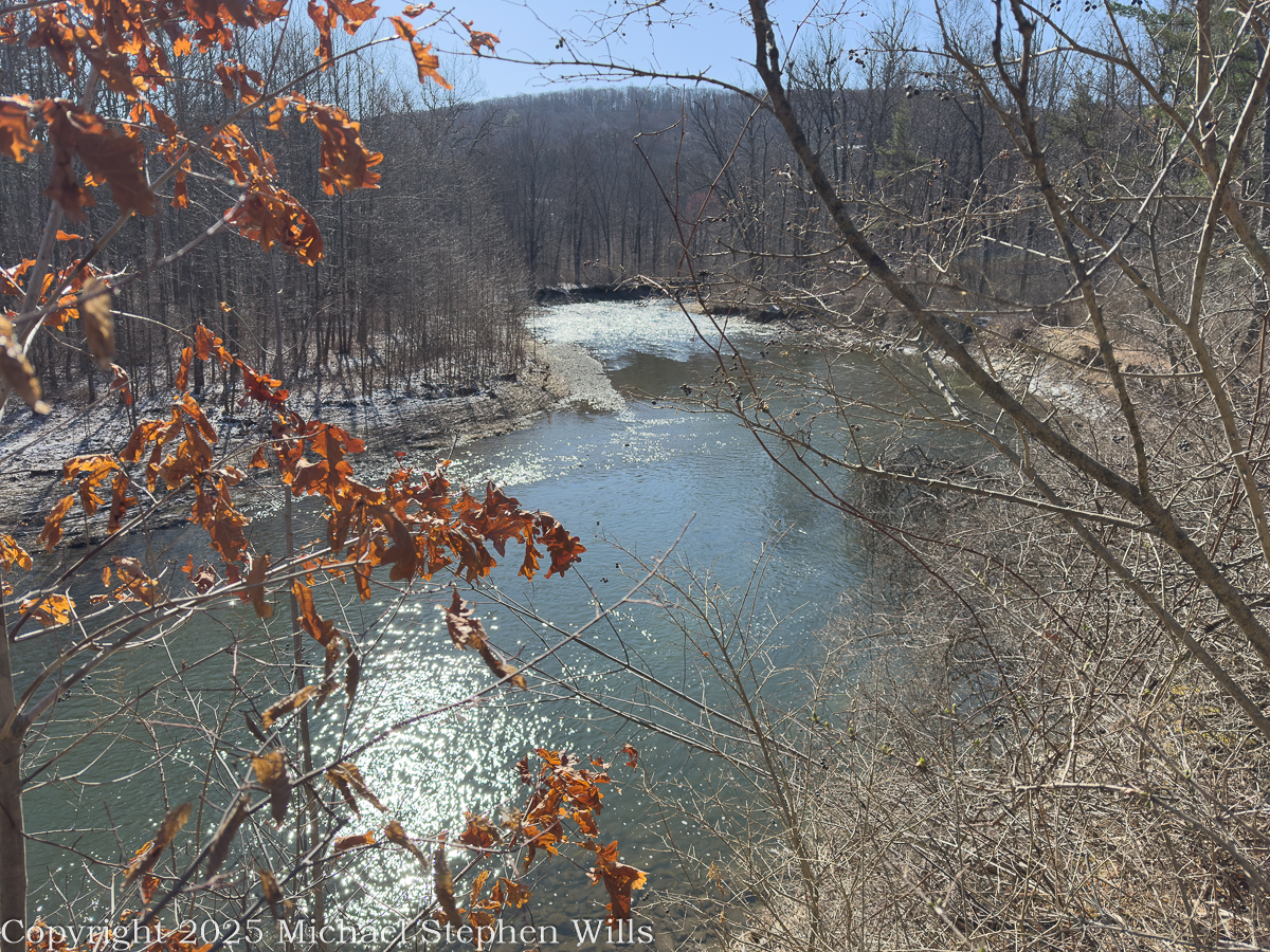 Sunlit bend of Fall Creek viewed from a high bank at Monkey Run in early spring.