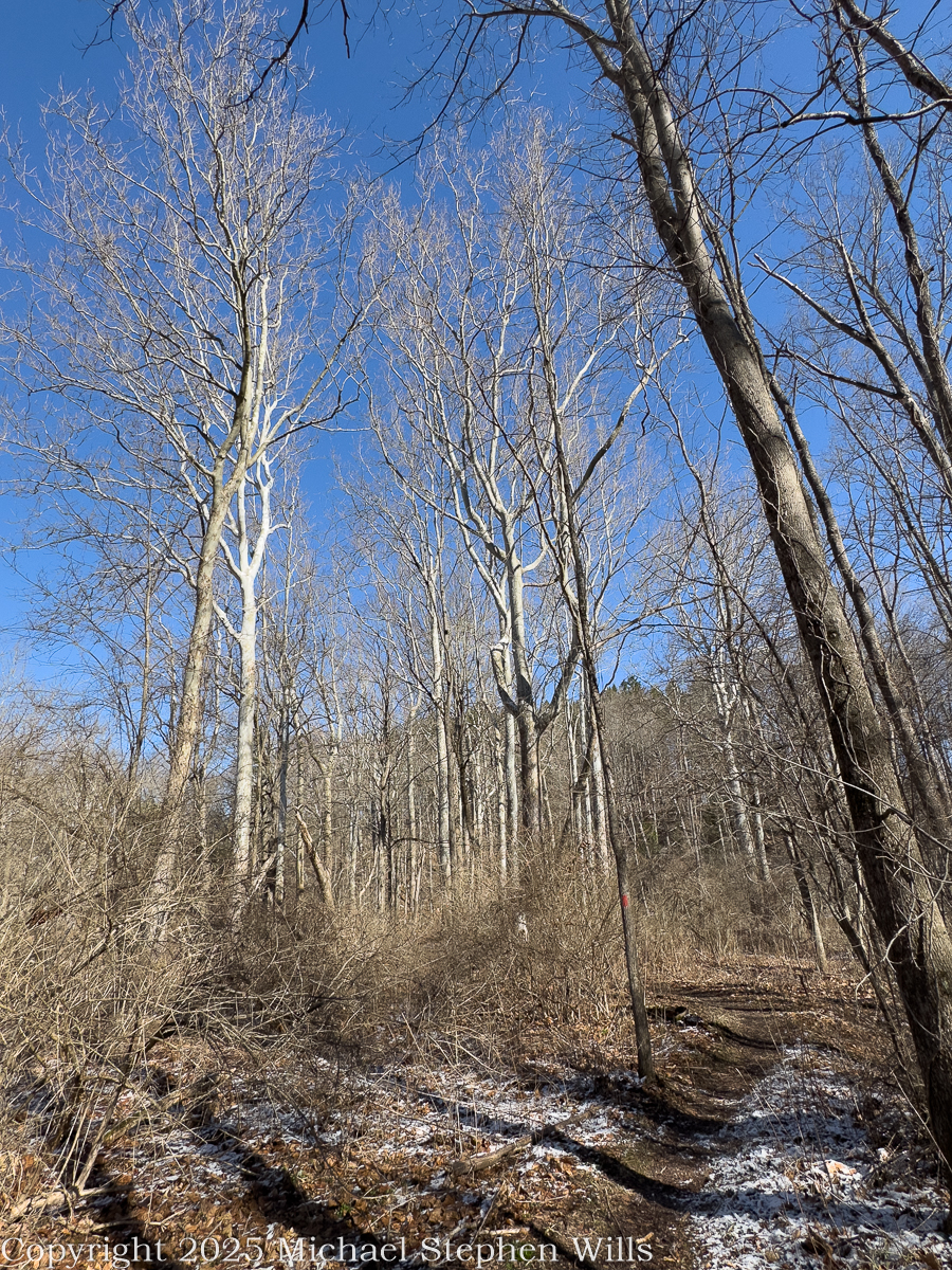 Tall white-barked sycamores leafless against a blue March sky at Monkey Run.