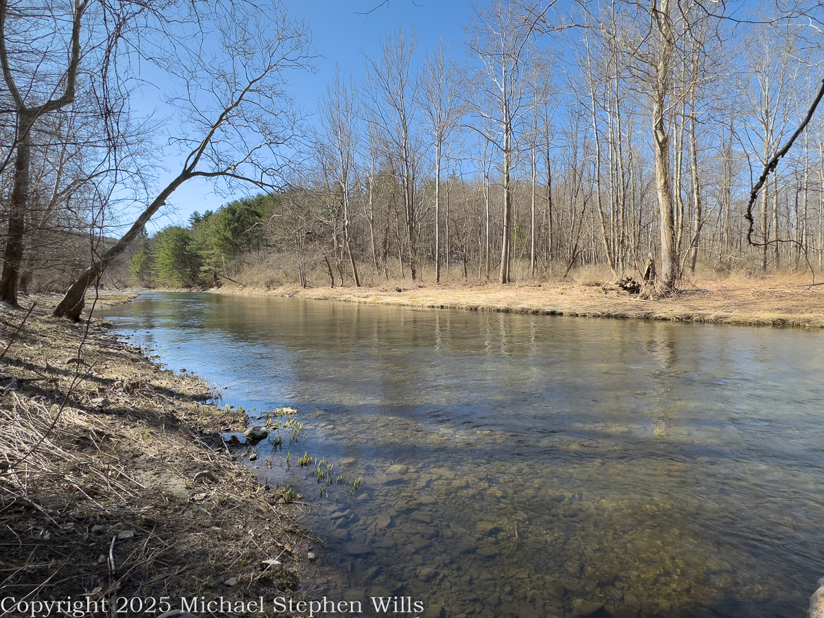 If you would learn a valley’s mind, walk a meander. The creek here composes with easy cursive, laying down a bar of gravel, nibbling at a bank of clay, then sweeping back to consider its work from the opposite shore. The geologist says the rock is Devonian, pages laid flat and damp with time, and the ice of ten thousand winters ago scoured them into the open. A creek is a patient mason, working without rest and never in anger. I admired these sycamores—their clean bones shining through the leafless canopy like the ribs of an old cathedral. Winter reveals their whiteness; summer grants them shade. A stand of white pines keeps a dark counsel in the background; on the muddy edge, green tongues of skunk cabbage push up, pledges made by the swamp to keep faith with the sun.