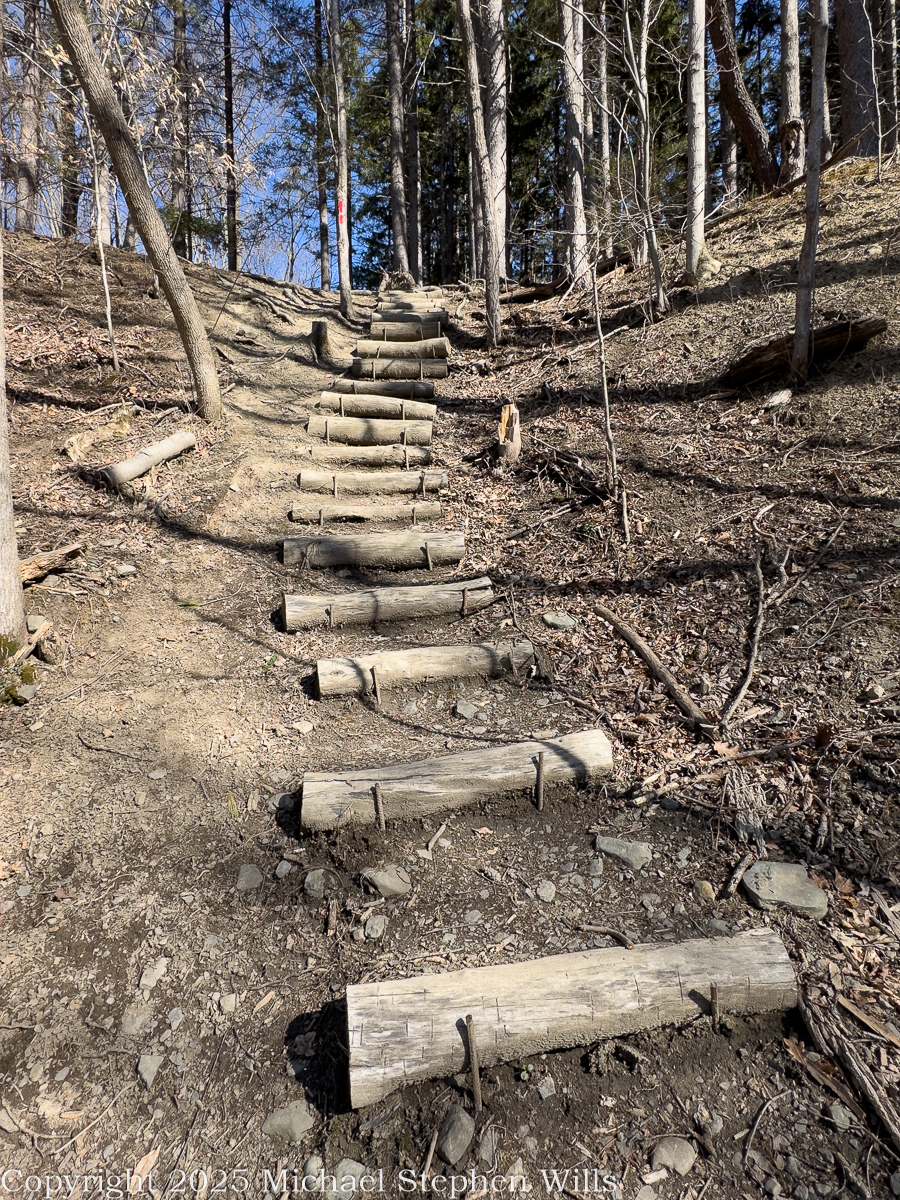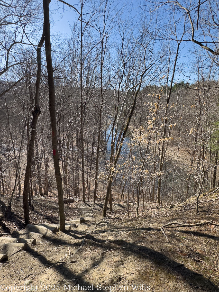 Steps cut from logs ascend the bluff, each tread pegged with iron, each rise a short confession of breath. I climbed to the ridge, paused halfway, and through the gray lace of March branches saw the creek shining at a bend far below. A man cannot help but measure his own life against such a course. The path goes up and down in obedient red blazes, but the water keeps its own counsel. Where the bank slumps the river shoulders through; where the bottom rises it lays down a mirror. In my youth I wanted the straight run, the short work. Now the curve pleases me. To go with the current and not be carried away—that is a lesson suitable to the grey in my beard.