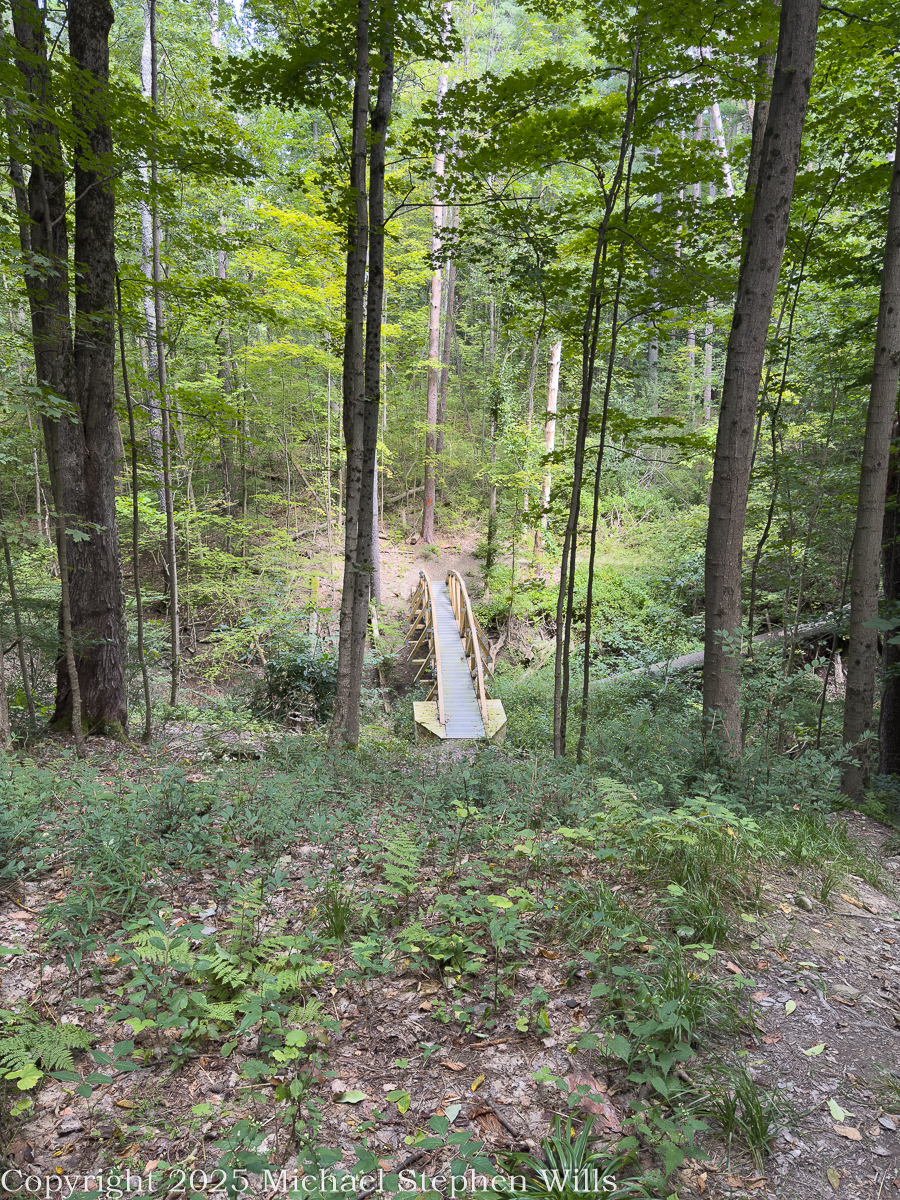 Arched wooden footbridge in summer forest on Cornell’s Monkey Run trail.