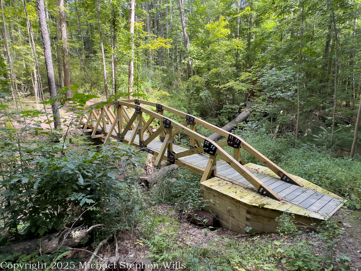 When I returned five months later, on August 23, the same path had forgotten the word austerity. The cathedral of sycamore was fully leafed, the white pillars now vanished behind a nave of shade. The pines perfumed the air without trying. A new footbridge—clean timber arching like a bent bow—spanned one of the wet flats. Its braces, black-bolted and handsome, looked as if they would hold the weight of an ox team or a file of schoolchildren. Such crossings are a kind of promise from the present to the future: we found a way through here; may you, too. Below, the floor was upholstered with moss, oak leaves, and a scatter of pinecones—the slow currency of the woods accumulating interest.