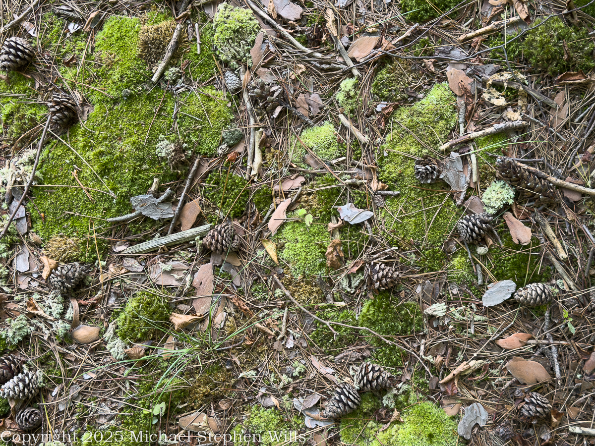 Moss, grass and pinecones on an overlook of Fall Creek
