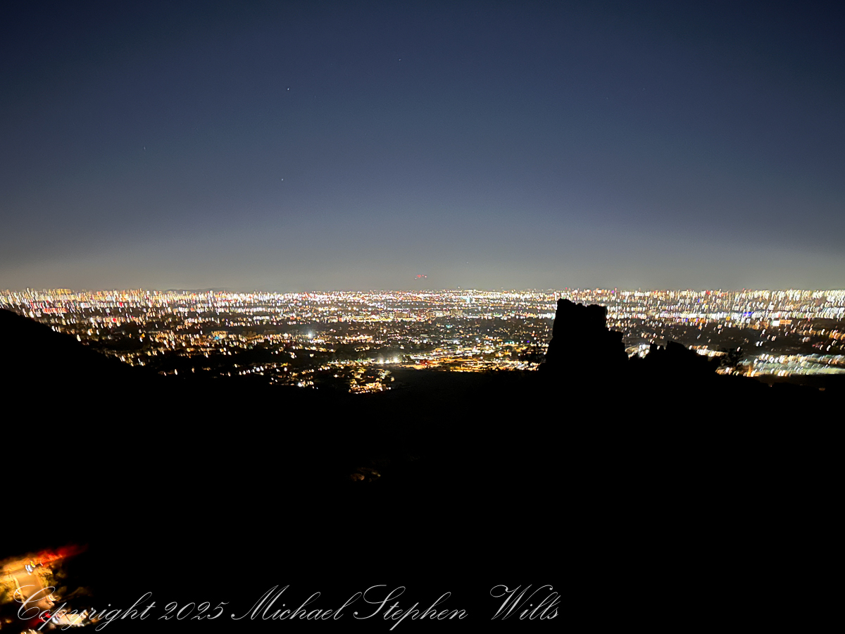 We reach a broad ledge just shy of the summit as the light finally spills over us. People are already gathered there: a trio of college students taking selfies, a pair of retirees sharing thermos coffee, a solitary man sitting cross-legged with eyes closed, face open to the warmth. The city below is suddenly transformed. The carpet of lights dims, replaced by the clear geometry of streets and rooftops, golf courses and parking lots, all laid out like a model at our feet. The mountains that hem the basin—once anonymous shapes—now reveal their ridges and ravines in sharp relief.