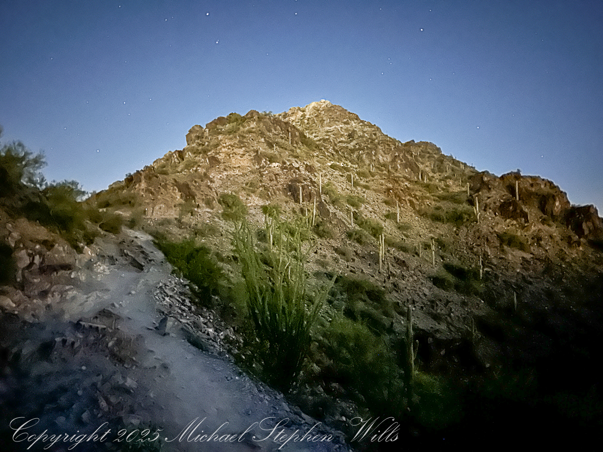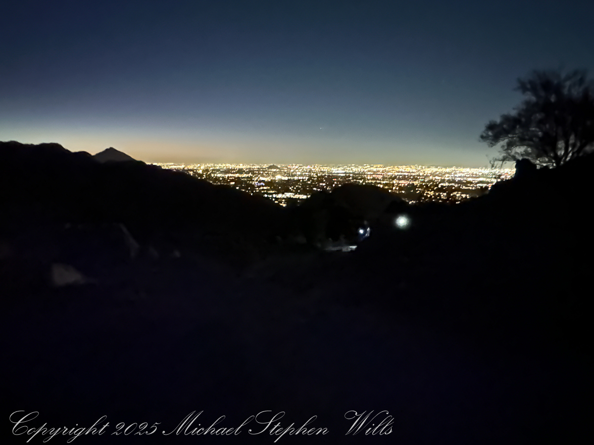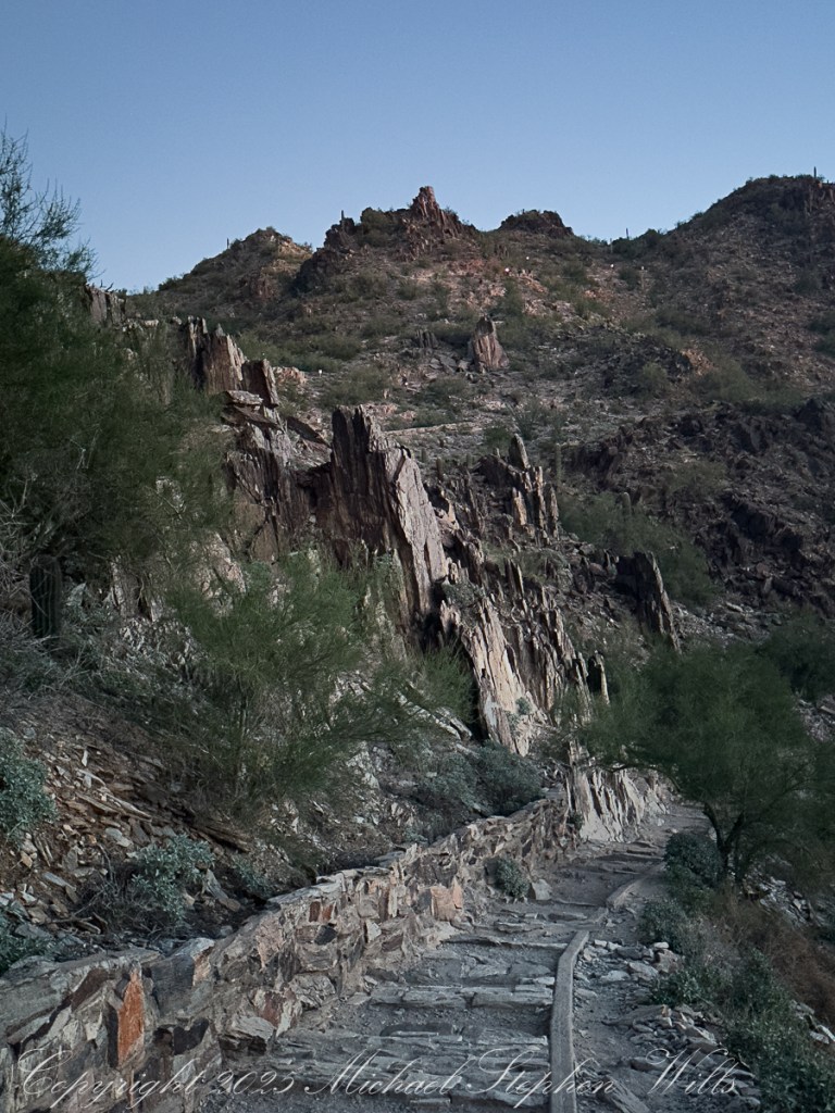 Arriving at 5 am there is a line of trucks and cars and Piestewa Peak parking almost full when I grab a spot in the predawn darkness. The desert air has that deep, merciful coolness it offers before sunrise, edged with the long-remembered scent of creosote. Car doors close with soft thuds, headlamps blink on, and a loose procession of strangers begins to funnel toward the trailhead like pilgrims, even now white and red headlamps sprinkle the upper slopes.