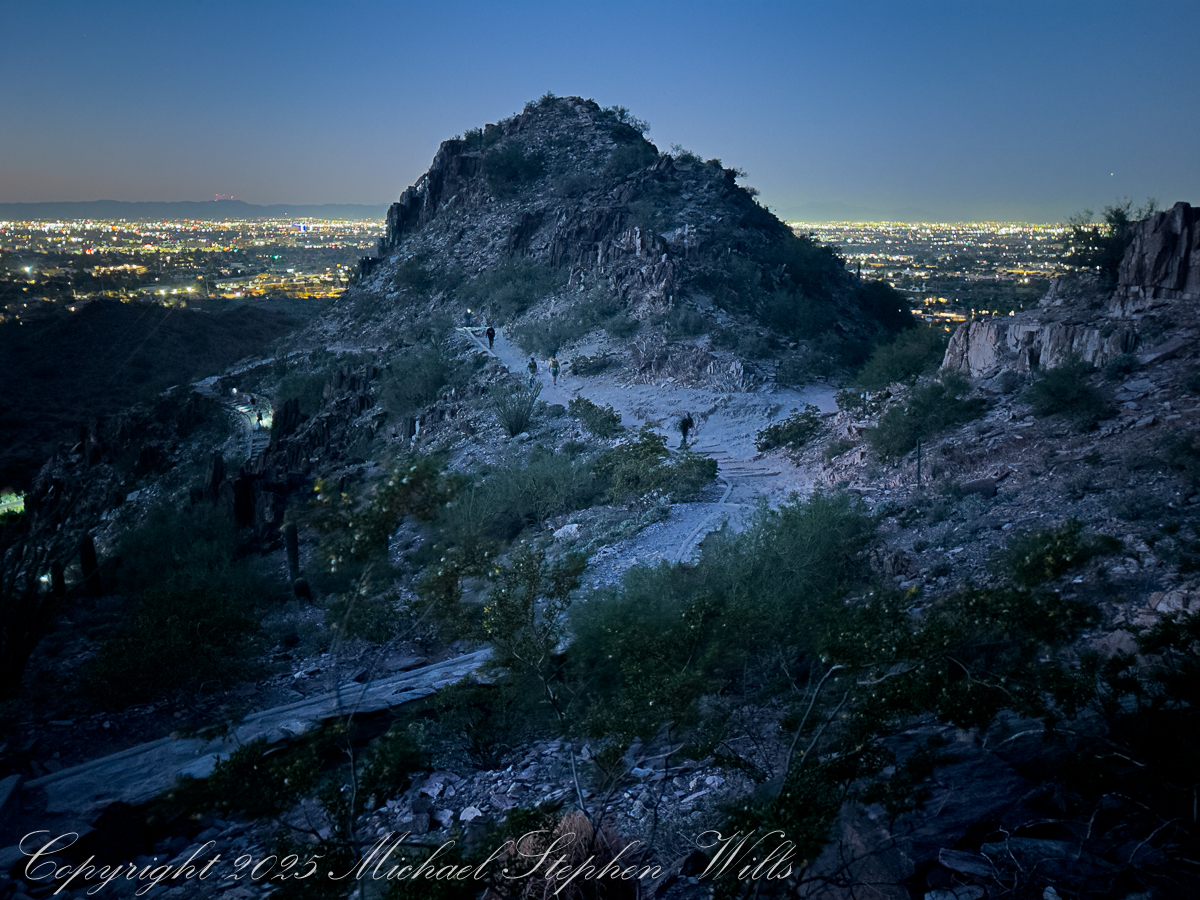 Down below, a new wave of hikers starts up the trail, latecomers walking into full daylight. We, the predawn climbers, share a small, quiet complicity. We have seen the city from the backside of night, watched the day arrive from a perch of jagged stone. Piestewa Peak has turned us, for an hour or two, into a single, breathing organism: many hearts, one climb, all of us stitched together by the steep path and the slow unveiling of the sun.