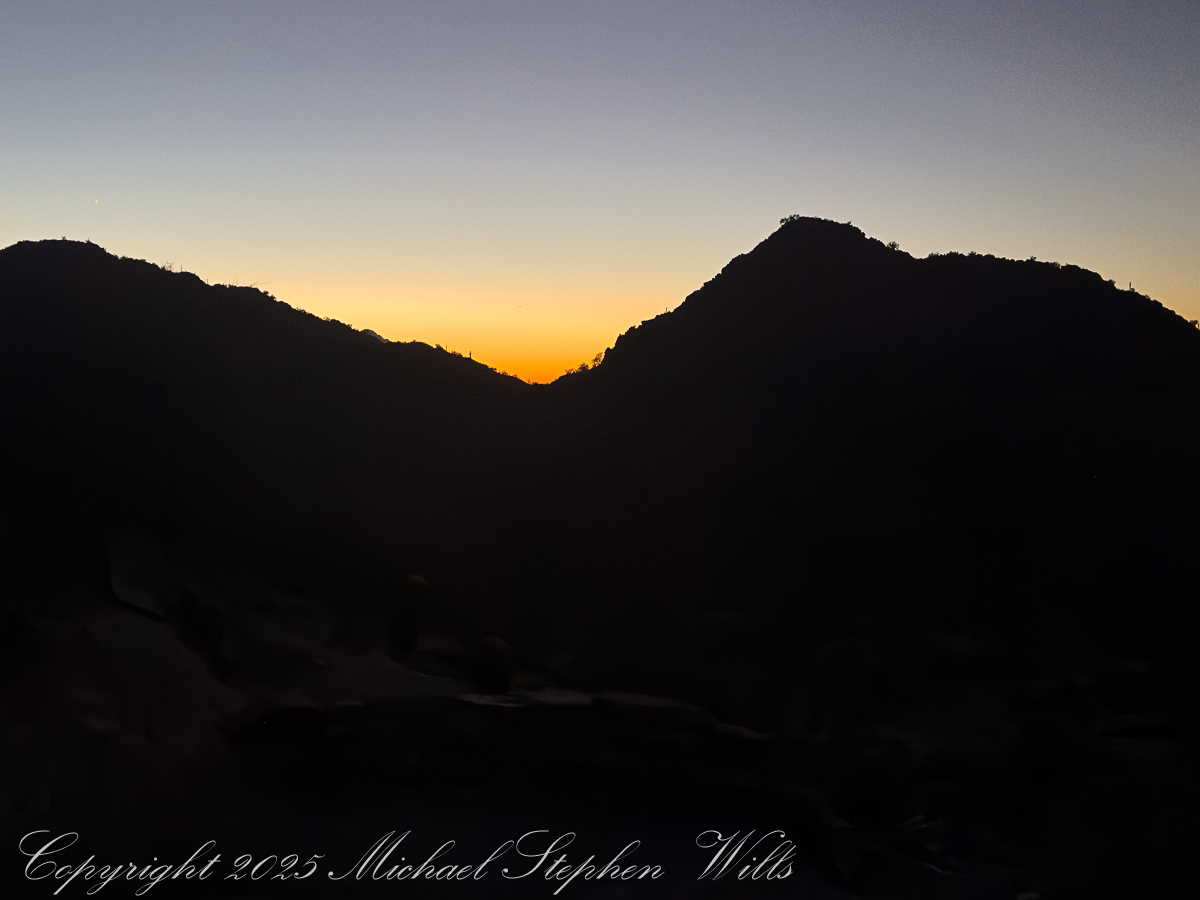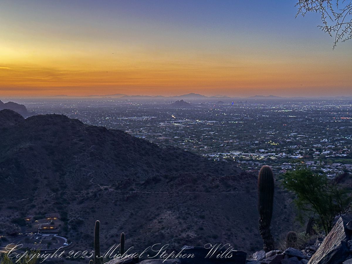The dark begins to soften at the edges. Over the eastern horizon a thin band of orange appears, a delicate seam between night and day. In one direction, the city stretches out in a glittering net of streetlights, the squares of parking lots and subdivisions catching the last of the darkness. In the other, the mountains are still black cutouts, their profiles sharp as paper against a gradually brightening sky. One of my images will hold that moment: the jagged ridge of Piestewa in shadow, the valley below already spangled with light, a single towering saguaro rooted at the cliff’s edge like a punctuation mark.