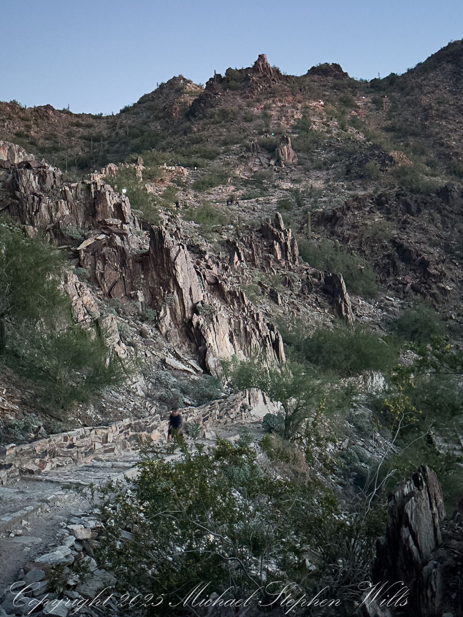 My beam catches a young couple just ahead, their hands knotted together. They speak Spanish, laughing quietly as they miss a step and bump shoulders. Behind me an older man in a Veterans cap leans heavily on trekking poles, his companion—maybe daughter, maybe friend—matching her shorter stride to his with patient care. A group of women in bright leggings and braided hair moves past us in a burst of energy, their languages overlapping—English, maybe Vietnamese, something I cannot place—like the weaving of a rug. A man passes me, a drum on his back. Piestewa draws them all, before dawn, to this rib of stone in the center of the Phoenix basin.
