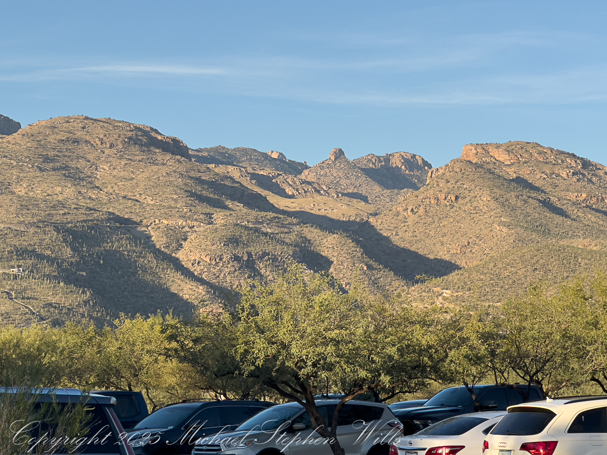 For a few minutes conversation dies away. Everyone seems to feel the same thing: that fragile instant when the sun clears the horizon and the desert shifts from silver-blue to gold. The rocks around us, sharp and broken in the photographs, glow honey-colored. Saguaros catch light on their spines, each thorn a tiny ember. Even the dusty air seems to shimmer.