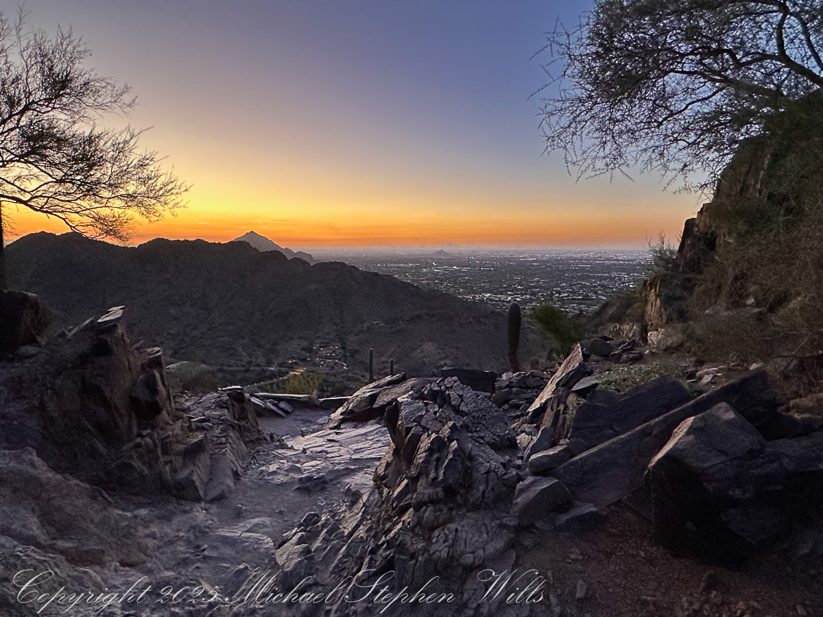 The last push to the saddle is steep, the steps uneven, the sky now a cascade of colors—copper, rose, faint lavender melting into a high dome of blue. The silhouettes of distant ranges sharpen: the Estrellas?, the Superstitions?, low ridges whose names I do not know. On the horizon, the first thin line of sun breaks free, setting fire to the edges of clouds. In another photograph, framed by dark rock and desert trees, that sunrise becomes a golden portal at the end of a shadowed corridor of stone.
