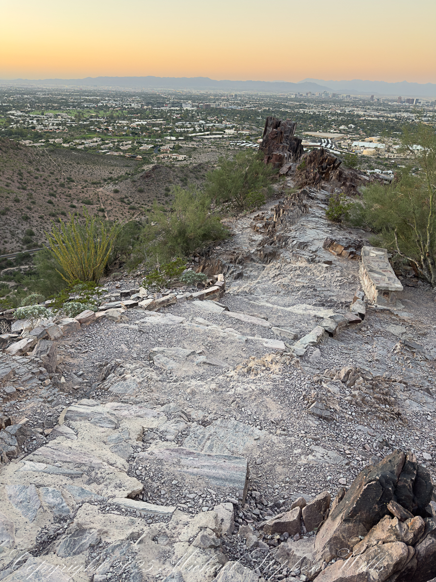 As I stop to rest myself and turn off my headlamp, ahead the trail tilts steeper the steps fade to rock, irregular and unforgiving: a stairway carved from ancient volcanic bones. With my dark adaptation, surfaces reflect star and city light, leading the eye down the ridge toward the dark quilt of neighborhoods below. Later, captured in the photograph, those steps will twist away like a stone dragon’s spine, the city waking beyond in soft pastels. Now they are simply work for legs and lungs.