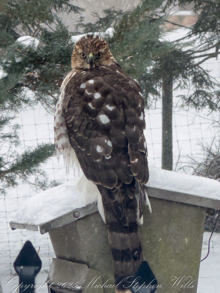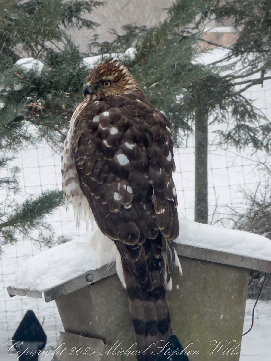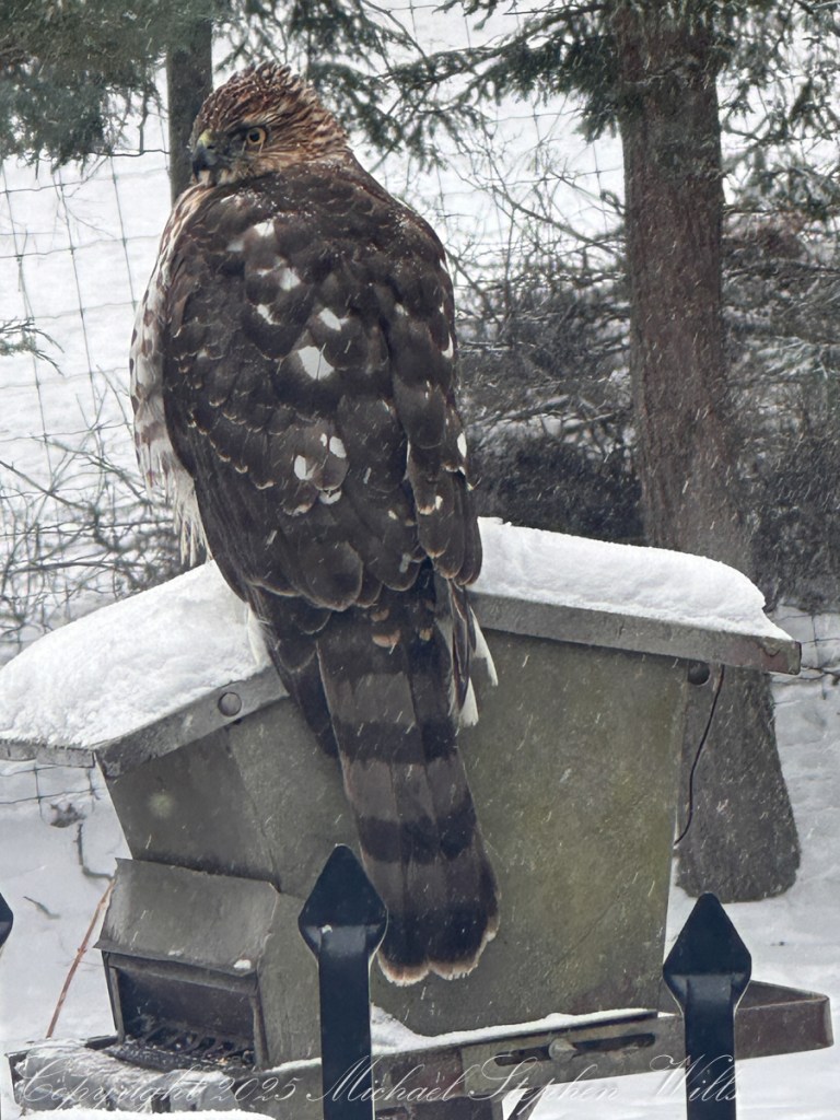Cooper’s Hawks are medium-sized accipiters, built for pursuit in cluttered spaces. Short, rounded wings and a long, banded tail allow them to thread through trees and shrubs with startling agility. In the Finger Lakes region in winter, they increasingly overlap with human habitats because bird feeders concentrate prey. The metal feeder roof in these images is mounded with snow, and the hawk has chosen it as a temporary perch—an elevated, stable platform that offers both a view of potential prey and a place to rest after a chase or to wait out a flurry of weather.
