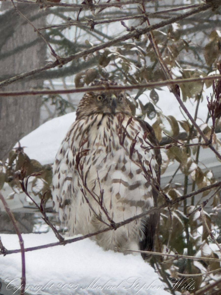 These four images and YouTube video document a winter visit by a juvenile Cooper’s Hawk (Accipiter cooperii) to our backyard feeder, captured on February 7, 2026, during a snowstorm in mid-morning light in sub-zero temperatures. The metadata places the sequence between 10:35 and 10:37 a.m., recorded on an iPhone 14 Pro Max with a 9 mm f/2.8 lens at low ISO (32) and fast shutter speeds—conditions that make sense for a bright, snowy day when reflected light is abundant and a moving subject demands short exposures. The bird itself, however, tells a longer story than the camera settings can.