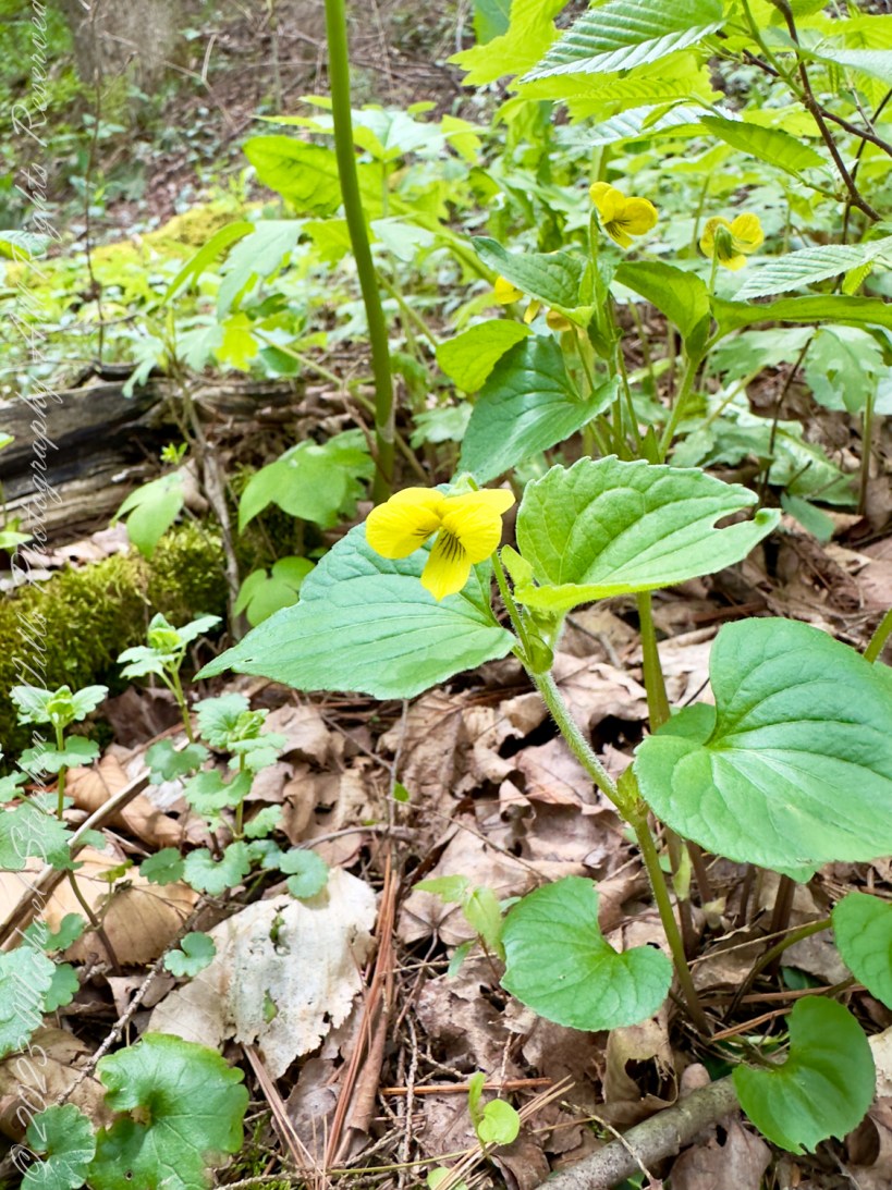 The yellow forest violet, Viola pubescens, with bright yellow flowers, serves as nectar source and butterfly host, indicating forest health and offering medicinal uses.