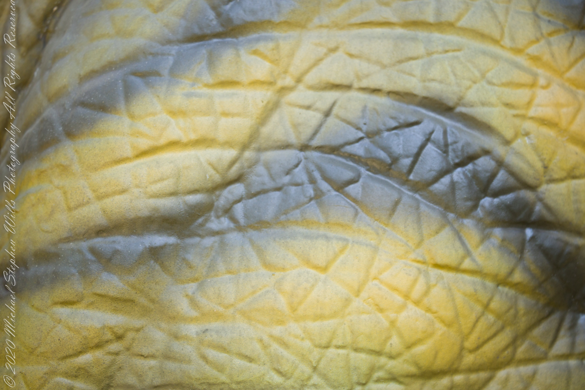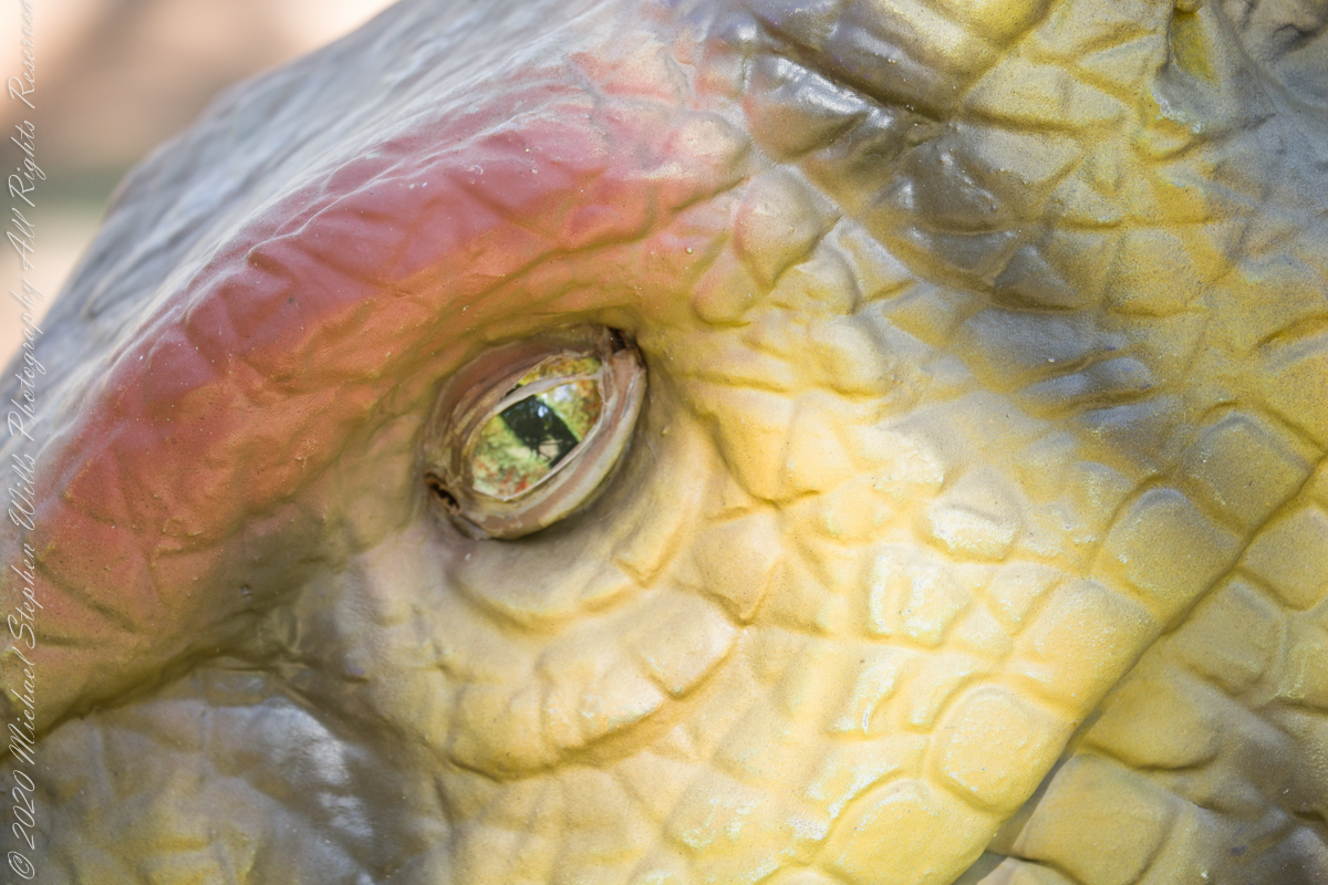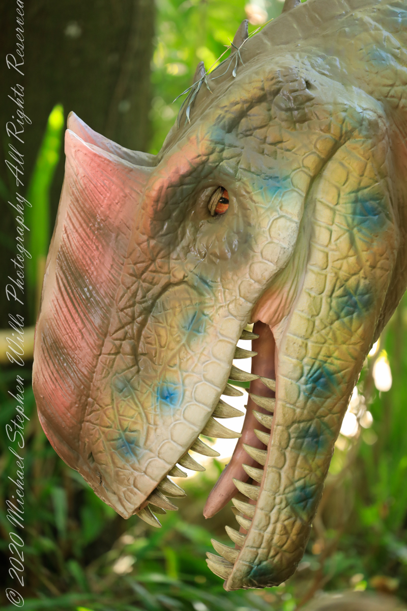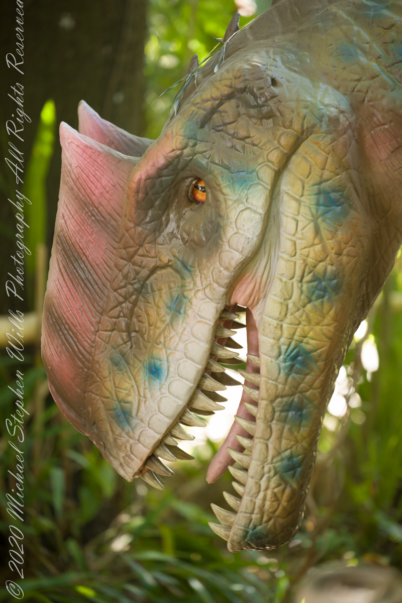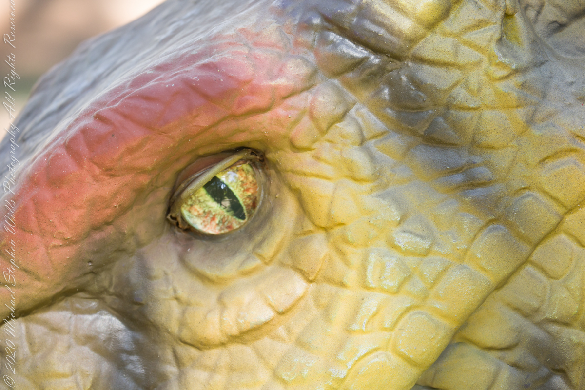 This sculpture has a nictitating membrane, a transparent or translucent third eyelid present in some animals that can be drawn across the eye for protection and to moisten it while maintaining vision. The animatronic sculpture includes the nictating membrane lowering over eye, moving jaws and body and a roar.