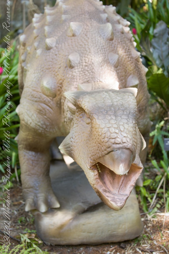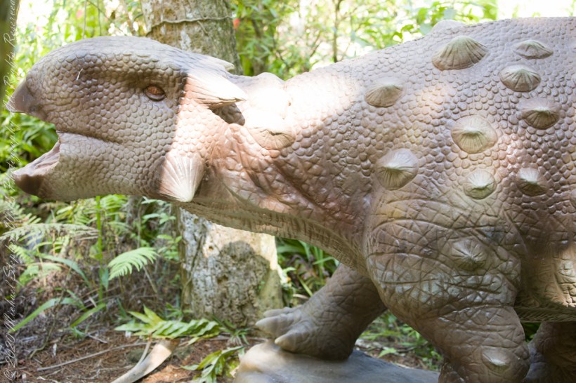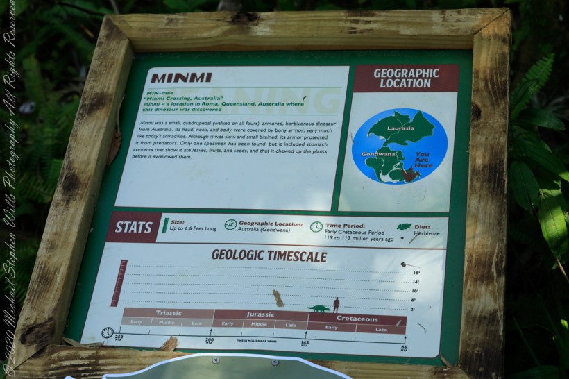 Minmi was a small, quadrupedal, armored, herbivorous dinosaur from Australia. Its head, neck and body were covered by bony armor, very much like today’s armadillos. Although it was slow and small brained, its armor protected it from predators. Only one specimen has been found, but it included stomach contents that show it ate leaves, fruit and seeds, and that it chewed up the plants before it swallowed them. Minmi is the location in Roma, Queensland, Australia where this dinosaur was discovered.