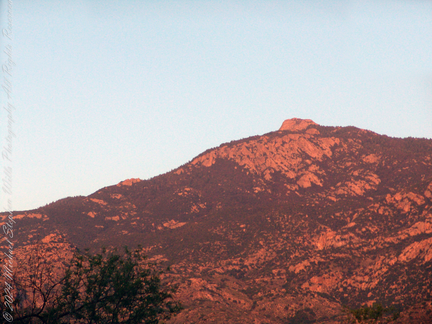 On the day we descended to the X9 Ranch via the Rincon Creek trail, we were granted a unique opportunity. My guide’s grandfather had a homestead at the X9, and his access to the trailhead through private lands opened this ro ute for us. That evening, I took a photograph of the sunset on Rincon Peak from the X9 Ranch, looking east from the ‘Rincon’—the corner formed by the massifs of Rincon Peak, Mica Mountain, and Tanque Verde Ridge.