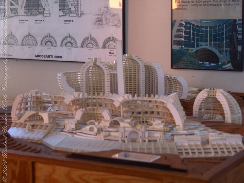 The plaque nearby described this design as part of a “Super Critical Mass” initiative, envisioned for a population of 5,000. The model represented an evolution from earlier prototypes, incorporating what Soleri called “nudging spaces”—areas designed to encourage spontaneous human interaction. I thought of my own neighborhood back home, how it felt fractured and isolated by its grids of asphalt and fenced-off yards. Could this model offer a blueprint for healing that divide?