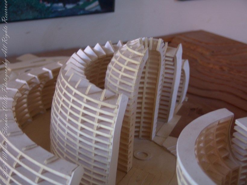 The model was perched on a wooden table, surrounded by blueprints and diagrams. Its sweeping curves and layered structures evoked the natural patterns of a canyon or the unfurling petals of a desert flower. I leaned in, drawn to its labyrinthine details: the arches that seemed to embrace the air itself, the layered grids suggesting terraces and communal spaces, and the towering central spire—a striking focal point that anchored the design. The model was an architectural plan, a vision made tactile, a conversation between the human spirit and the earth it inhabits.