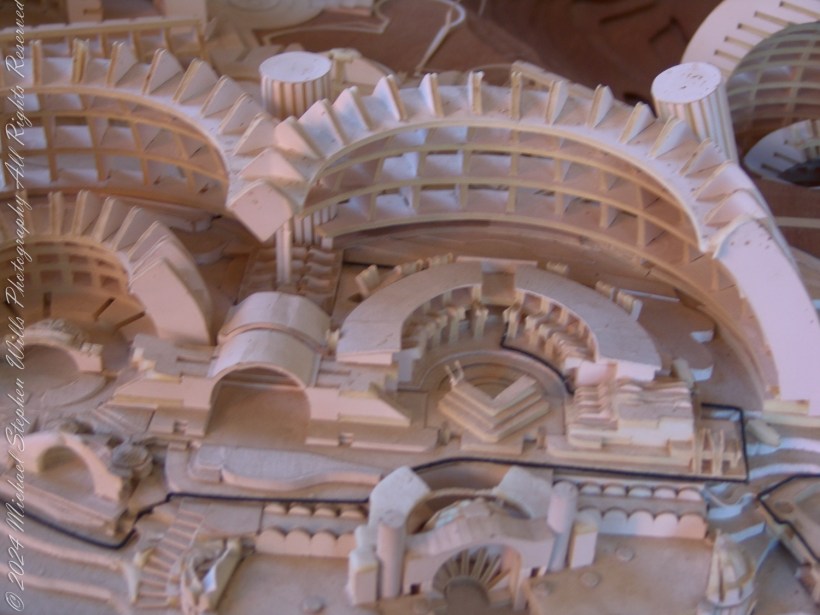 In that moment, the gallery was silent except for the soft click of my camera. I wanted to capture not just the model, but the feeling it evoked—the delicate balance of hope and humility. The metadata on the image files would later remind me of the precise day and hour I stood there, absorbing this vision of what might be. But no timestamp could fully capture the spark it ignited—a sense that, even in a world burdened by consumption and waste, there remained a path forward, winding like a desert trail through arches of light and shadow.