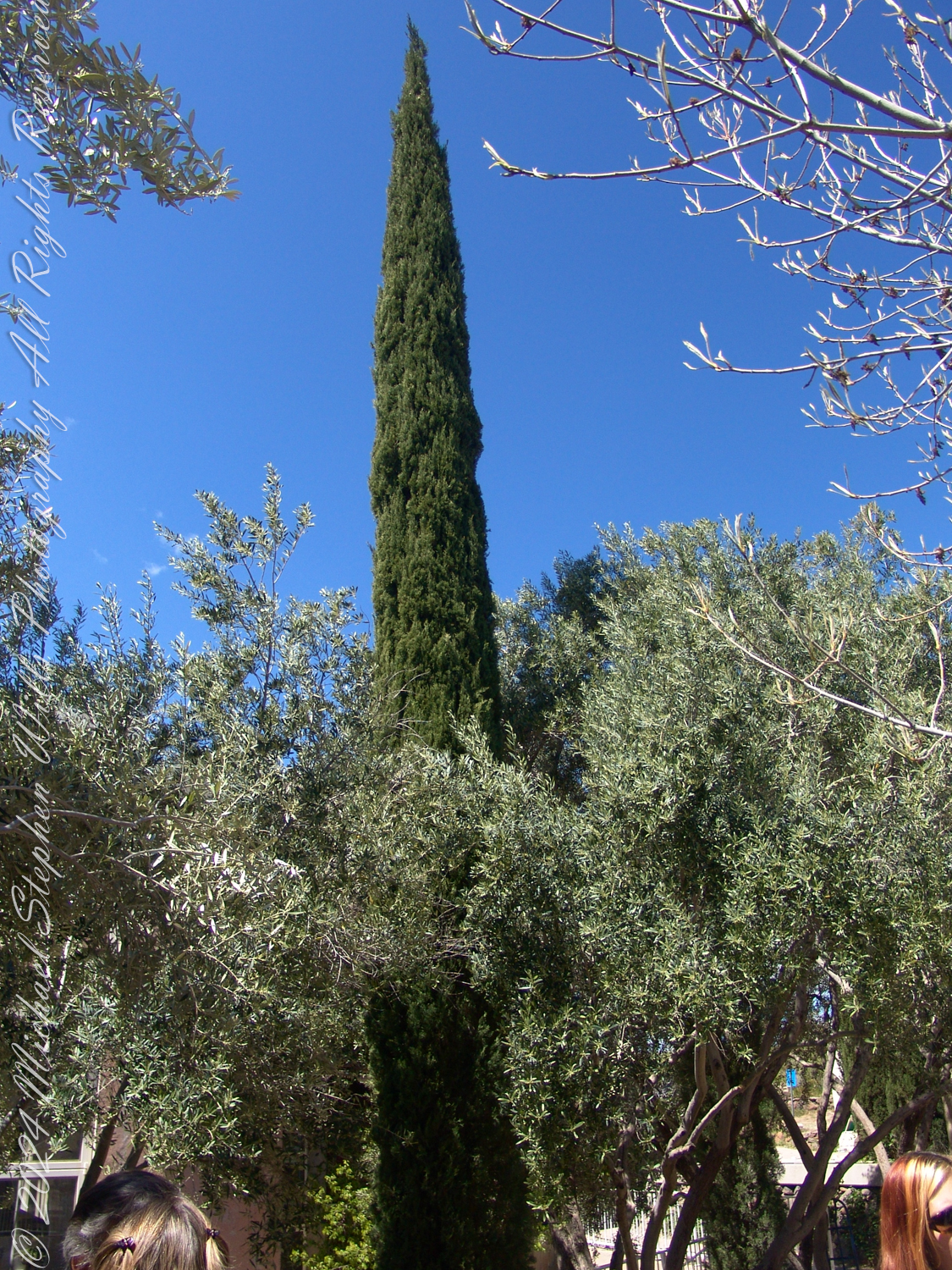 The trees stood tall and still, their presence both steadfast and serene. The cypress trees, their slender forms reaching toward heaven, seemed like exclamation points on the landscape, their verdant green cutting through the sky’s azure expanse. Beside them, olive trees spread their silvered arms, their gnarled trunks telling stories of endurance and quiet strength. One cypress, in particular, caught my attention—so perfectly straight, so impossibly regal, as if it had been planted by the hand of a god.