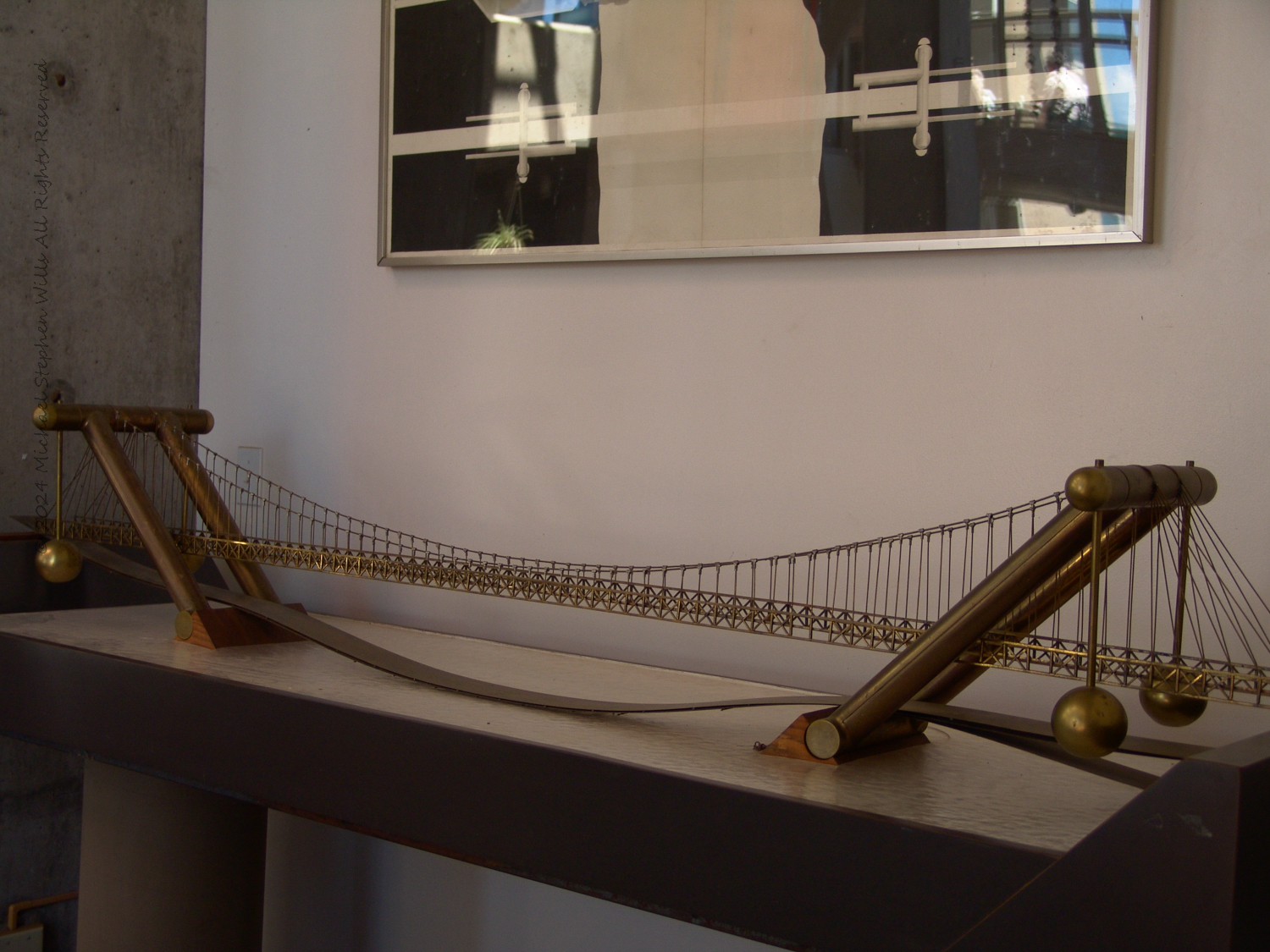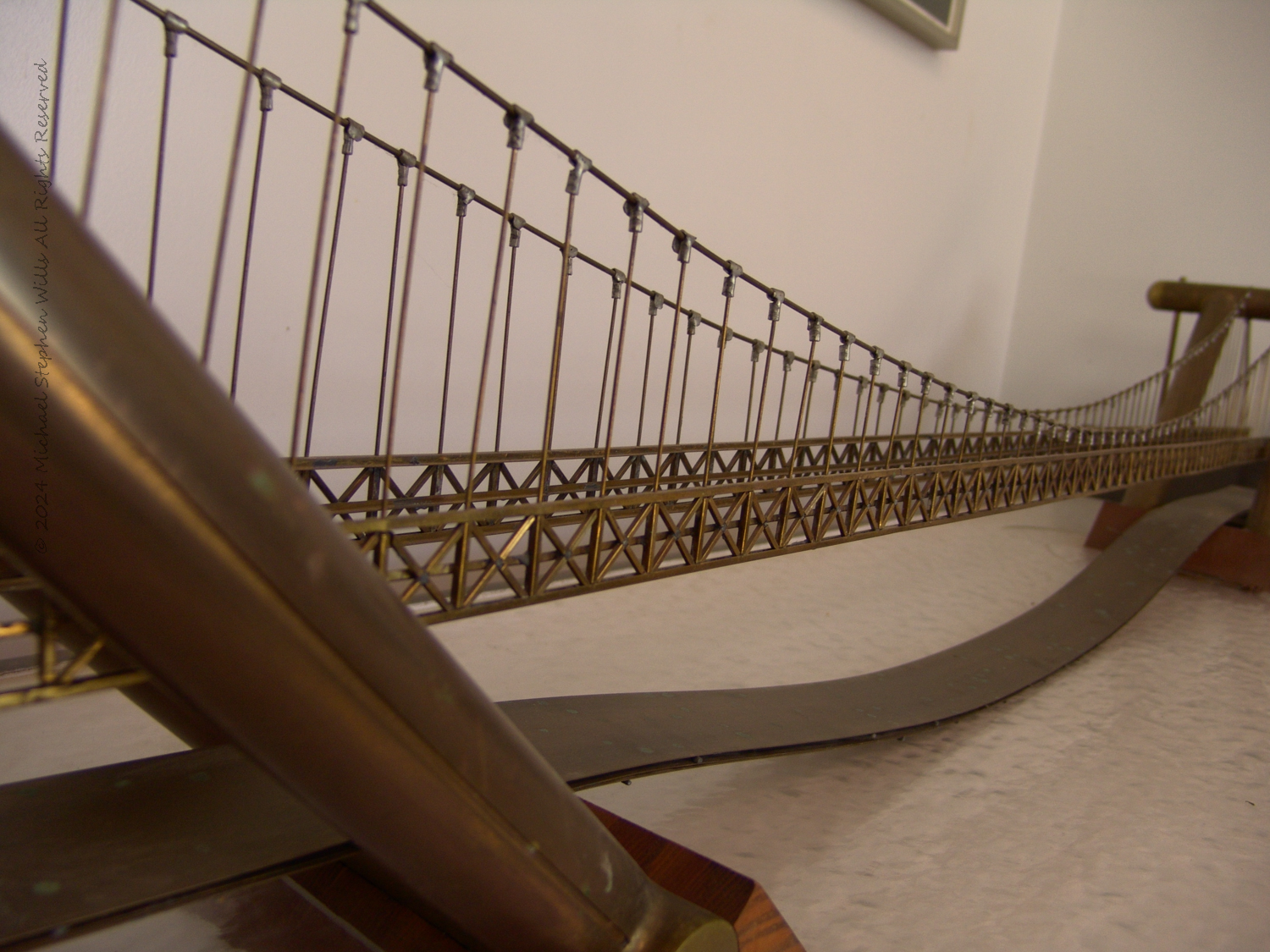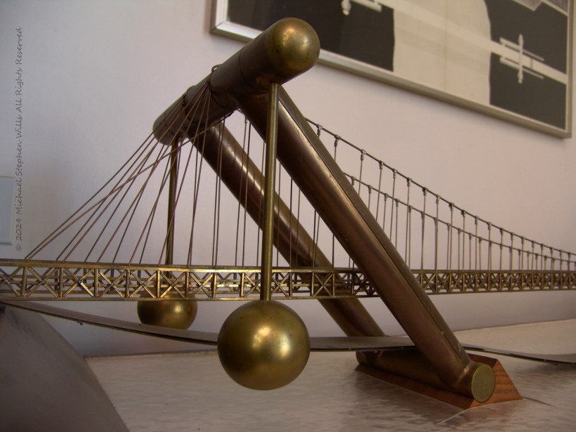 The bridge stretched across the table, a golden ribbon suspended in perpetual motion. Its delicate cables, taut and slender, mirrored the veins of a great urban organism. I leaned closer, catching the glint of light on the brass framework, which seemed to hum with possibility. The slanted pylons, bold and angled at 45 degrees, rose like colossal compass points charting a path into a future yet unbuilt. Their elegant incline gave the structure a sense of poise and power, as though it were both rooted in the earth and ready to leap skyward.