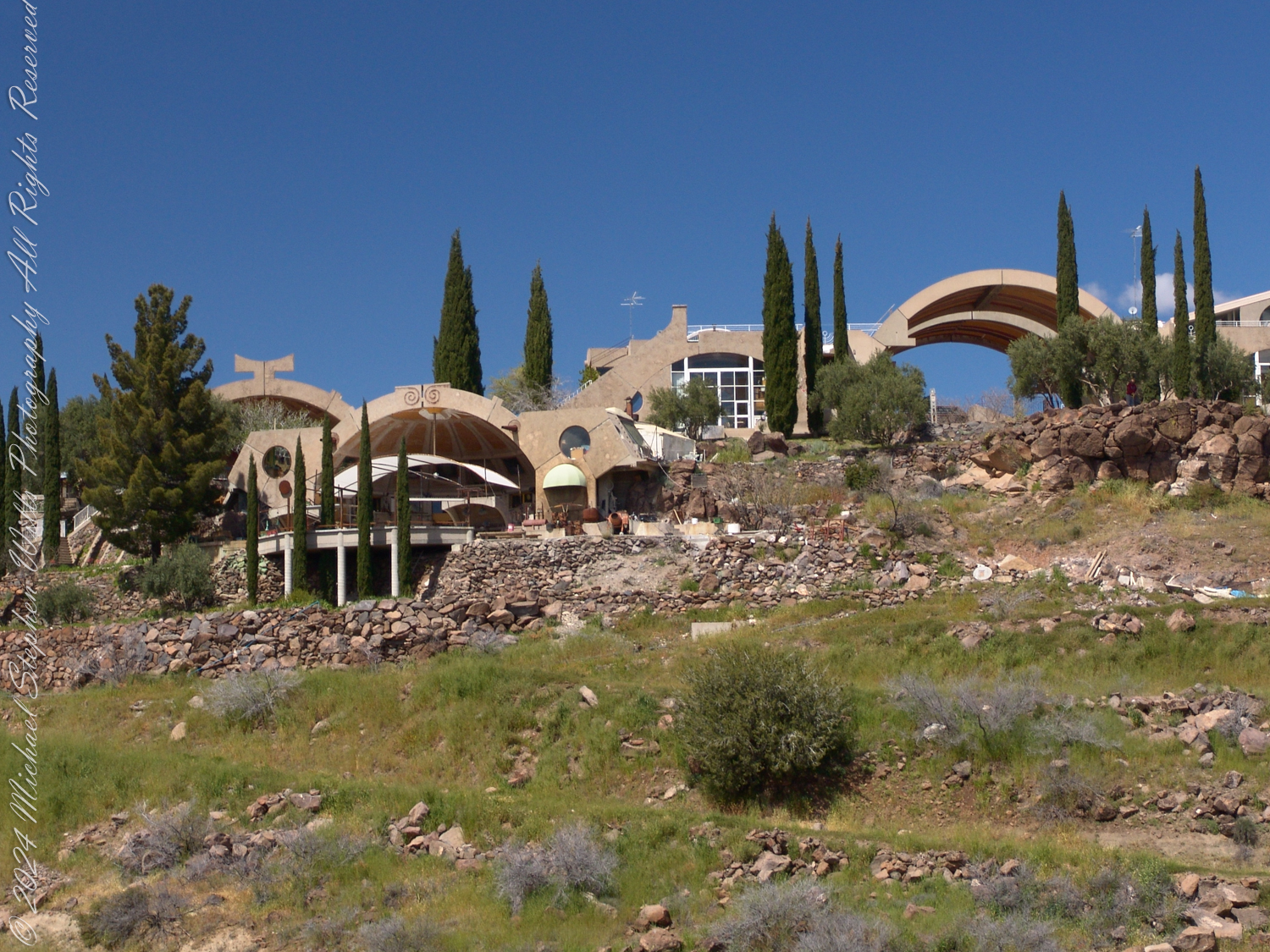 Each turn at Arcosanti revealed yet another viewpoint, another carefully composed alignment of architecture and nature. The sweeping views of the Arizona desert, framed by bold circular cutouts, were a reminder of our smallness in the grand scheme of things. The cypress trees standing tall against the rugged cliffs offered a contrast of textures—natural and man-made—that felt uniquely Solerian. His vision was alive in every corner: the terraces, the staircases, the unassuming balance between the earth’s rawness and humanity’s imagination.