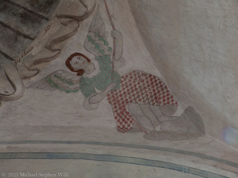 And in the arch’s corner, an angel descends—painted simply, yet with care. The figure pulls at a rope, perhaps to ring a bell or lift a curtain, a symbolic act of revelation or invitation. With wings green and soft, a skirt patterned in red flowers, suggesting femininity, grounding the divine in local textile tradition. The angel bridges the earthly with the divine, echoing the mission’s purpose: to guide and accompany.