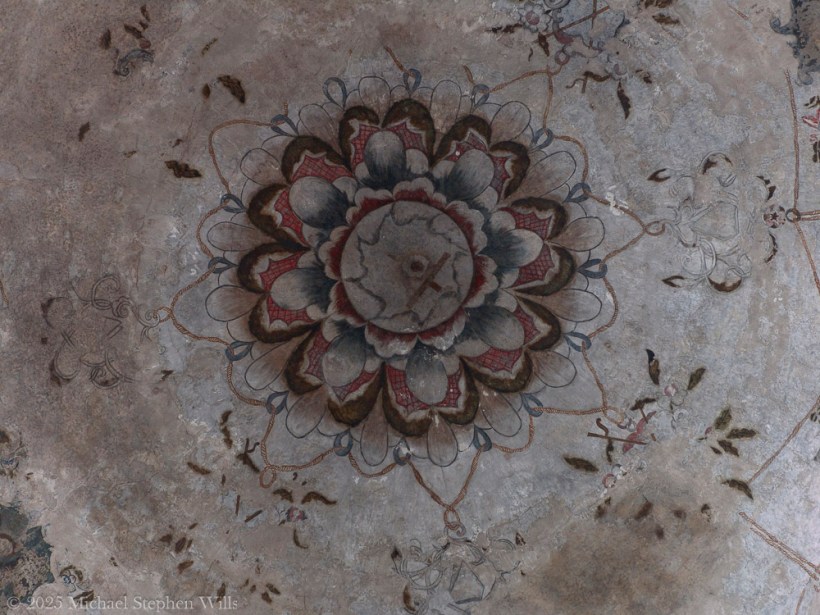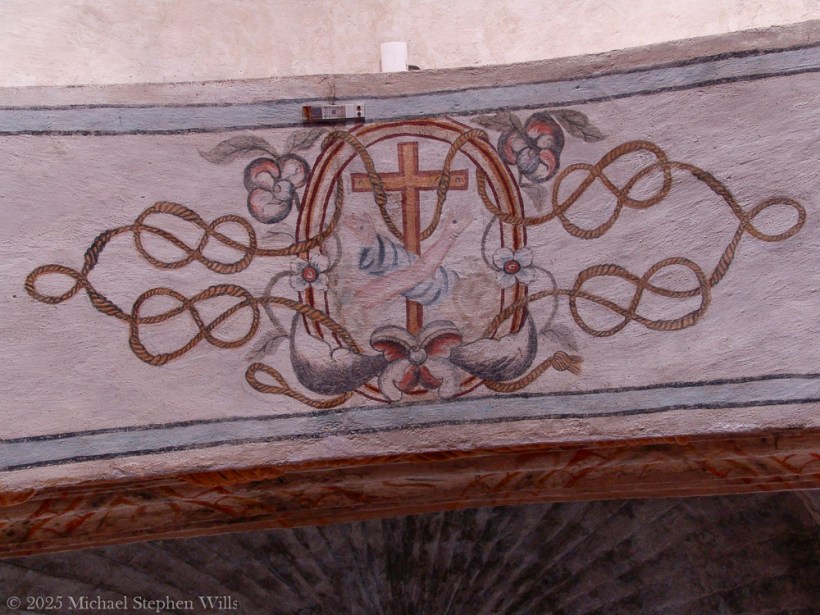 The fresco, with its cross flanked by stylized doves and roses, extends the Passion’s symbolism into sacred geometry. Doves—universal emblems of peace and the Holy Spirit—face one another in symmetrical grace, drawing the eye into the cross they flank. The single length of curling, intertwined golden ropes bind all elements in unity, perhaps reflecting divine infinity. The floral elements speak to rebirth and resurrection, a soft counterpoint to the harshness of the Crucifixion. Here, pain and peace coexist in a visual hymn.