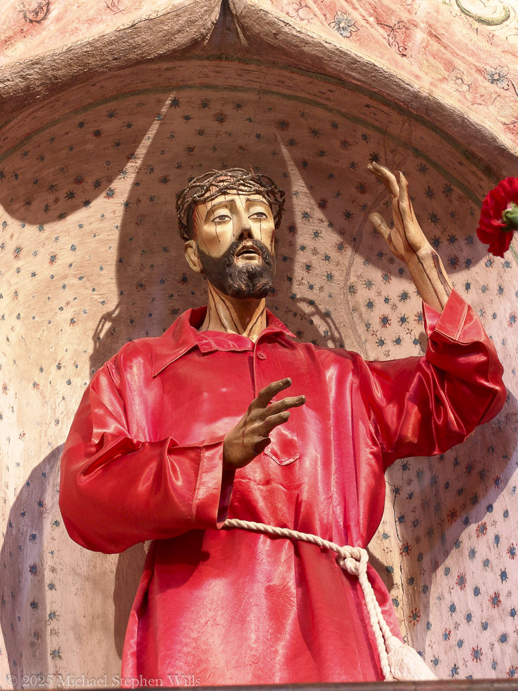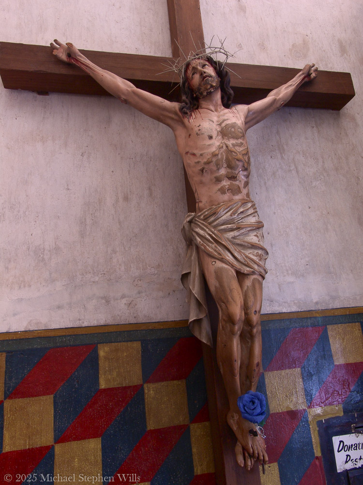 The crucifix dominates the first image—the depiction of Christ crucified, emaciated, bruised, crowned with thorns. His suffering is not abstract but visceral, carved in every wound and strained muscle. This figure of Christ, so brutally human, is draped in a tattered loincloth, a humble covering amid divine sacrifice. At his feet rests an offering: a blue artificial flower, incongruent in its brightness yet perfectly placed, a modern votive that expresses both reverence and continuity. It reminds us that humble devotion endures.