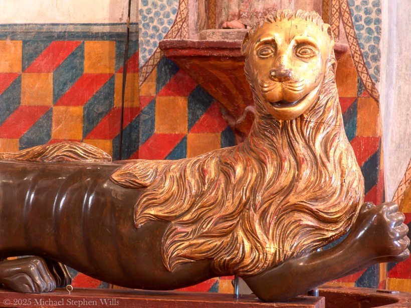 The lion sculpture, oddly cheerful in its golden face, seems at first a puzzle. Yet within Christian iconography, the lion often represents Saint Mark, the Evangelist, or the power and vigilance of God. This lion, rendered with stylized curls and a strong, reclining pose, guards the sanctuary. Its gilded mane mirrors the opulence of heaven, even in this humble desert mission. The lion’s curious gaze invites us to move past fear, toward the mysteries within.